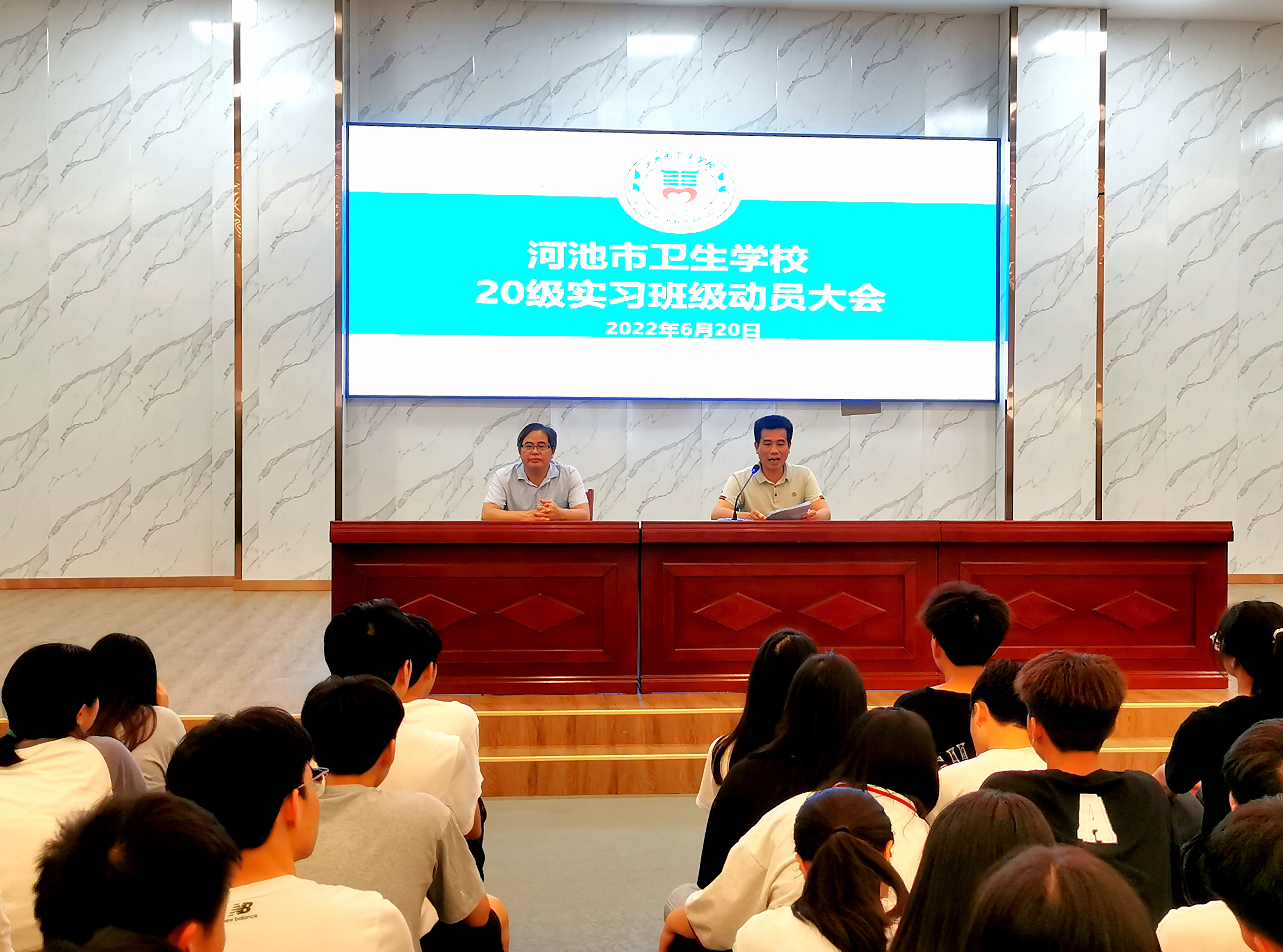 2022年6月20日,河池市卫生学校举行了2020级实习班级实习前动员大会。学校党总支书记、校长陈朝亮,分管实习的教务科科长白震,学生科副科长覃贝以及548名农村医学、医学影像技术、医学检验技术、中医康复、中医等5个专业的实习生参加了本次会议,大会由教务科科长白震主持。