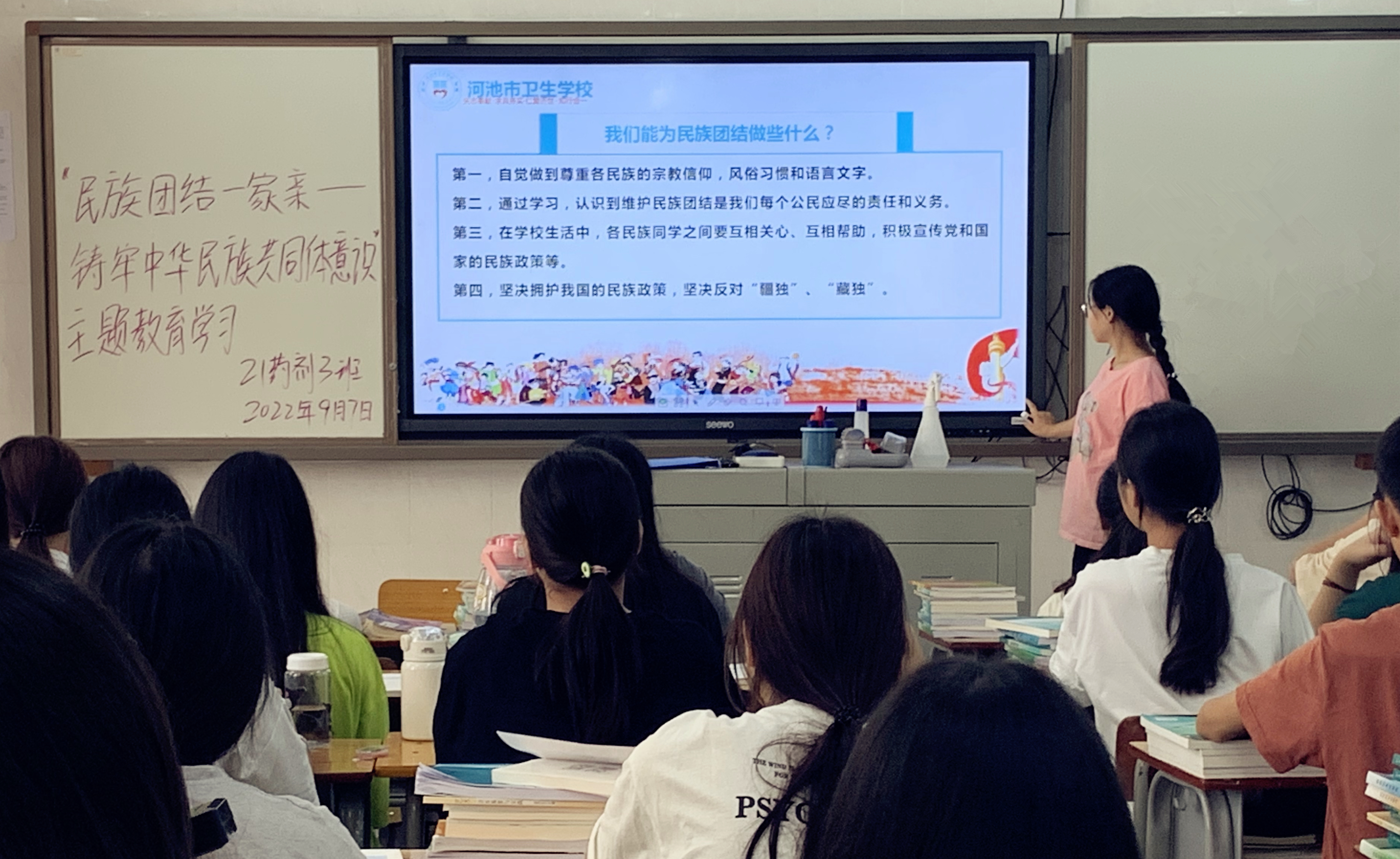 学校以主题班会的形式,由班主任引导、班干部组织开展“民族团结一家亲——铸牢中华民族共同体意识”宣传教育。通过宣传讲解,让各族学生们学习国家的民族相关政策,明白加强民族团结教育对于增强民族团结、维护祖国统一、保持国家的长久稳定的现实意义和历史意义,了解作为一名学生应该如何维护民族团结。通过主题教育活动,把民族团结种子埋入每个青年学生的心灵深处,增强大家对伟大祖国、中华民族、中华文化、中国共产党、中国特色社会主义的认同,厚植学生的爱国主义情怀,像石榴籽那样紧紧抱在一起,以全新精神面貌迎接新学期的学习生活。