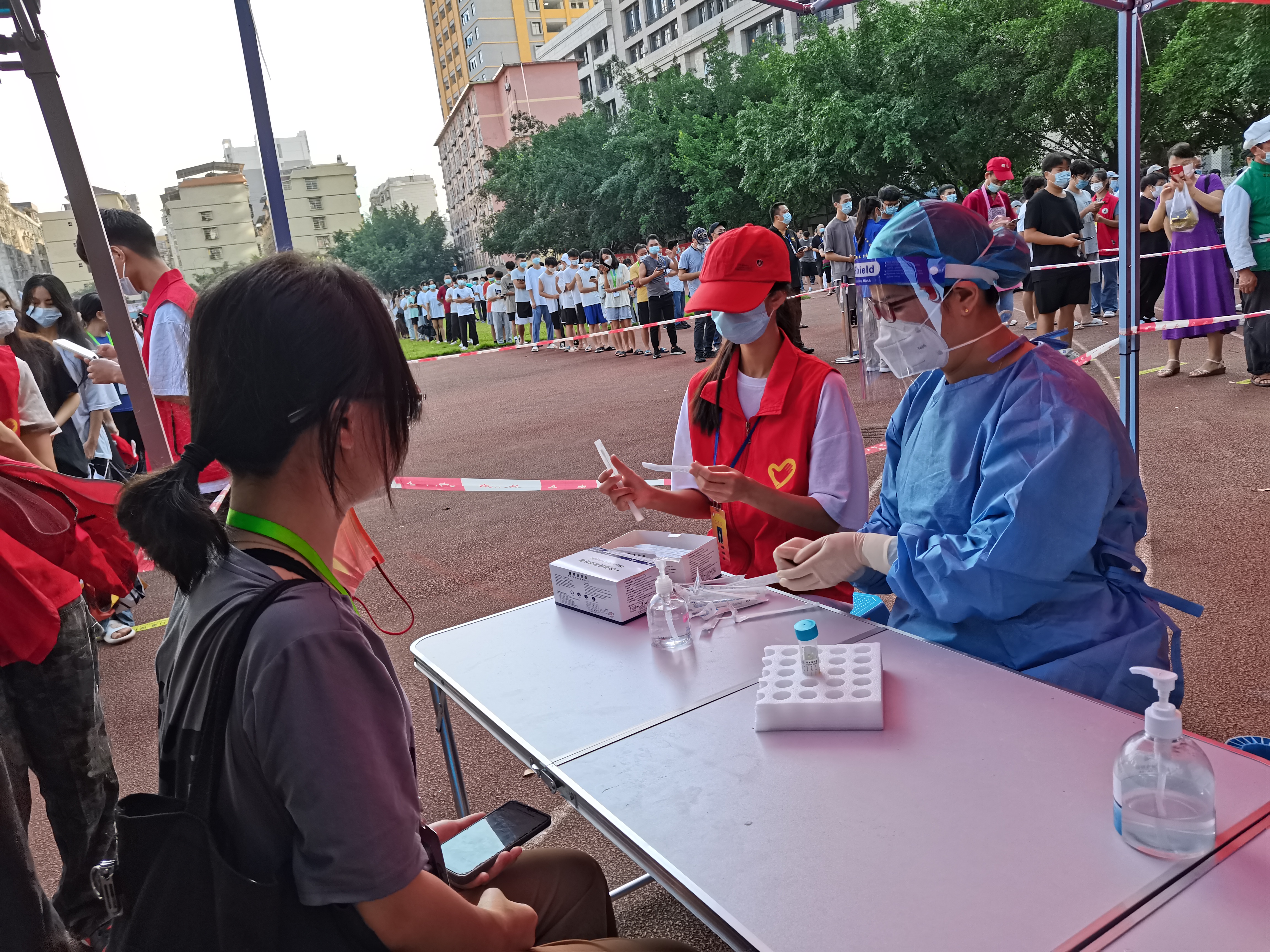“太阳很大,天气很热,辛苦是肯定的,但是疫情当前,我们作为卫校的学生应该发挥技术专业,克服困难。同时,我们也可以收获了很多核酸采样的经验。”21检验班的梁彩秘同学激动地说。