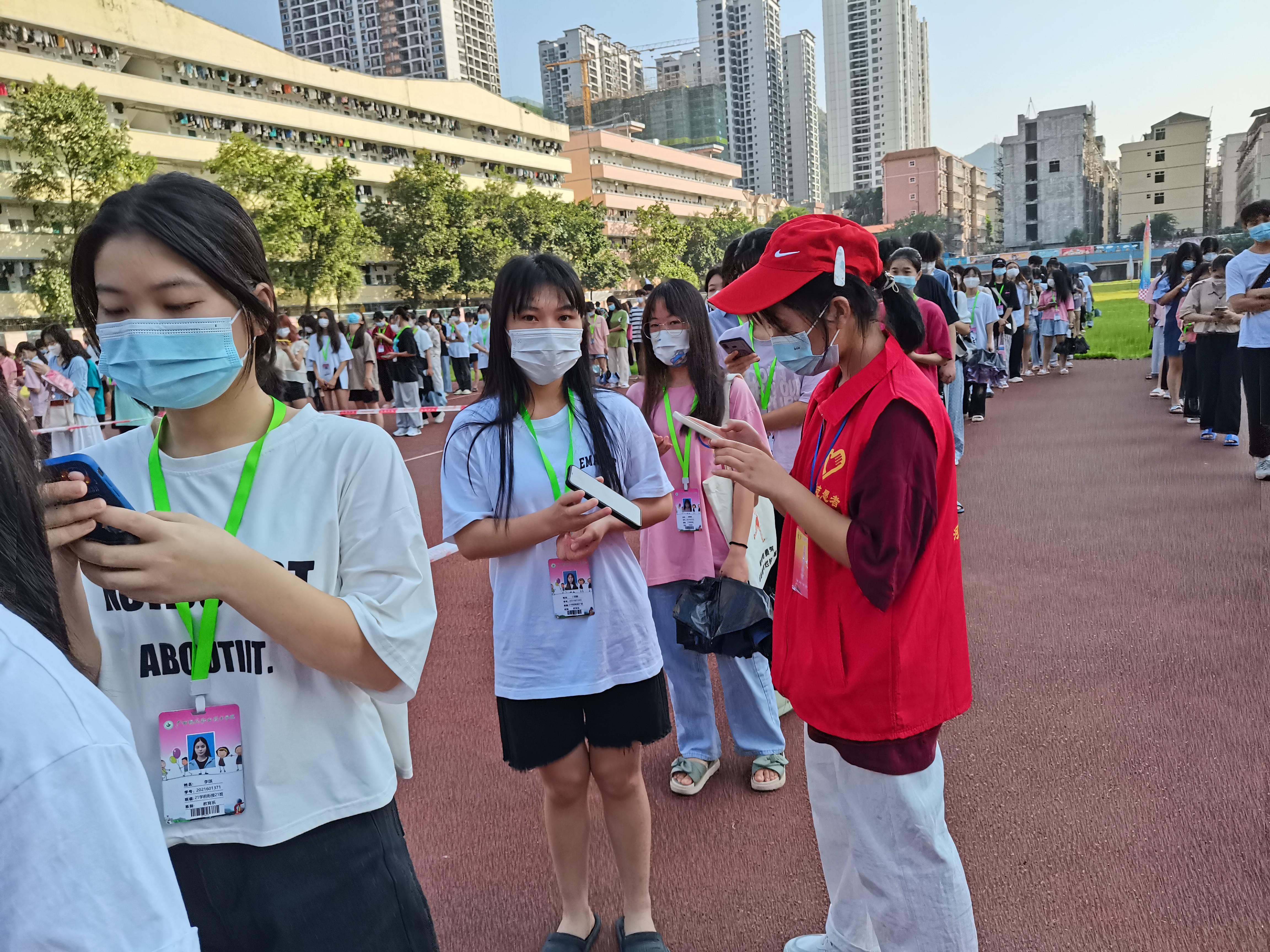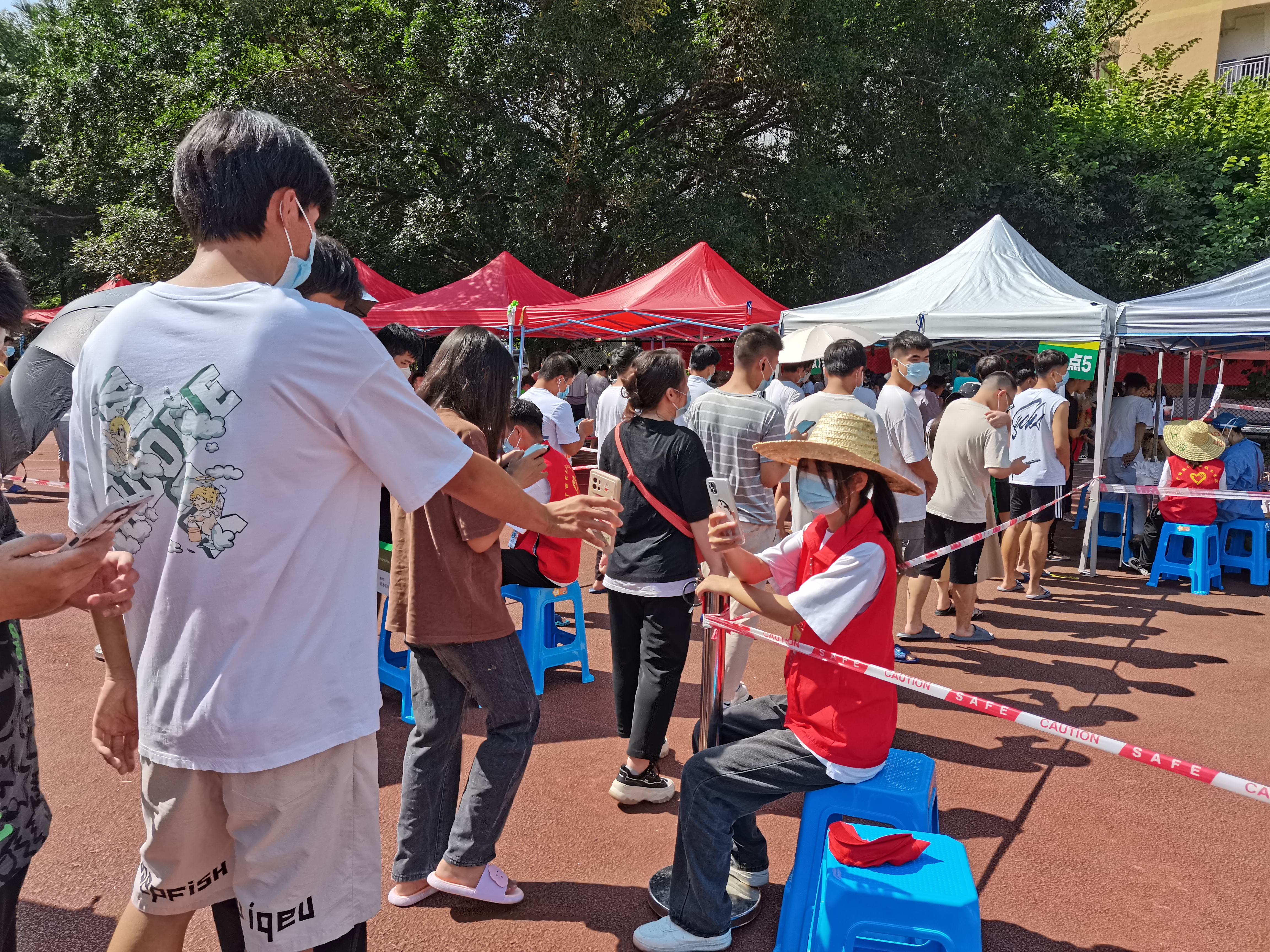 在河池市职业教育中心检测点,学生志愿者们配合医院医护人员进行信息录入和维持秩序,忙个不停,为职教中心的师生们带来温暖和力量。虽然天气炎热,但是每个志愿者依然坚守岗位,仍保持着良好的工作状态,只为了尽快完成核酸检测工作,当日协助医院共采集核酸9500人次。