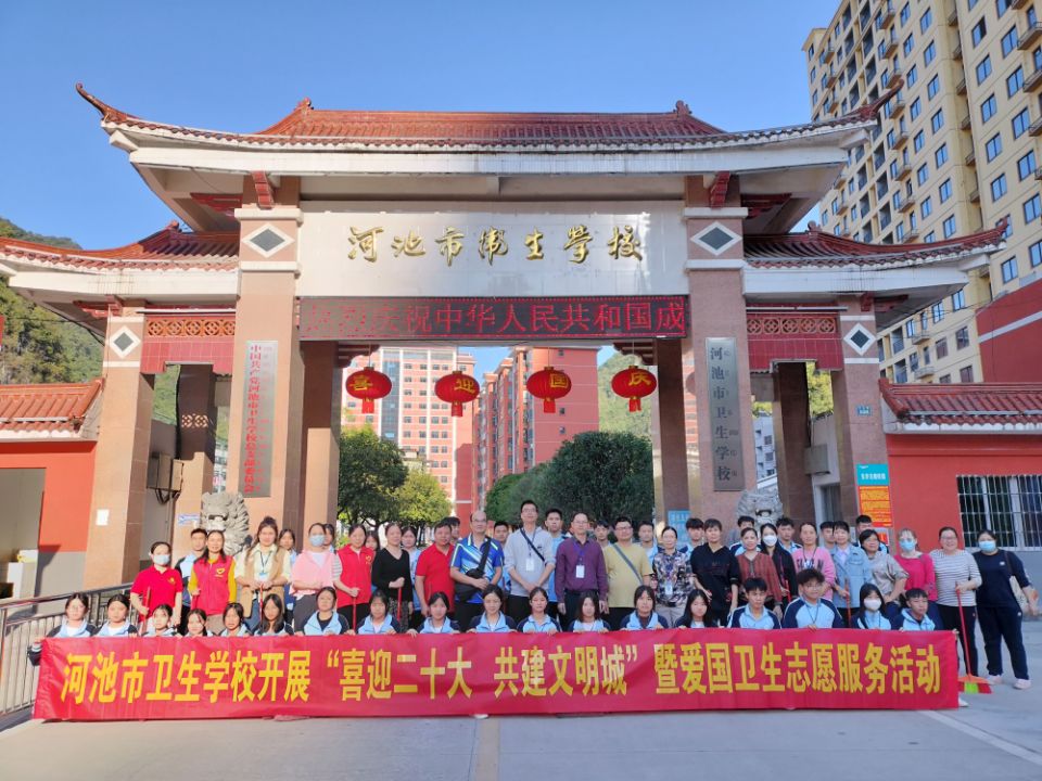 为迎接党的二十大胜利召开,助力河池市文明城市创建工作,河池市卫生学校于2022年10月13日下午,组织全校师生深入学校卫生责任区开展“喜迎二十大 共建文明城”暨爱国卫生志愿服务活动。