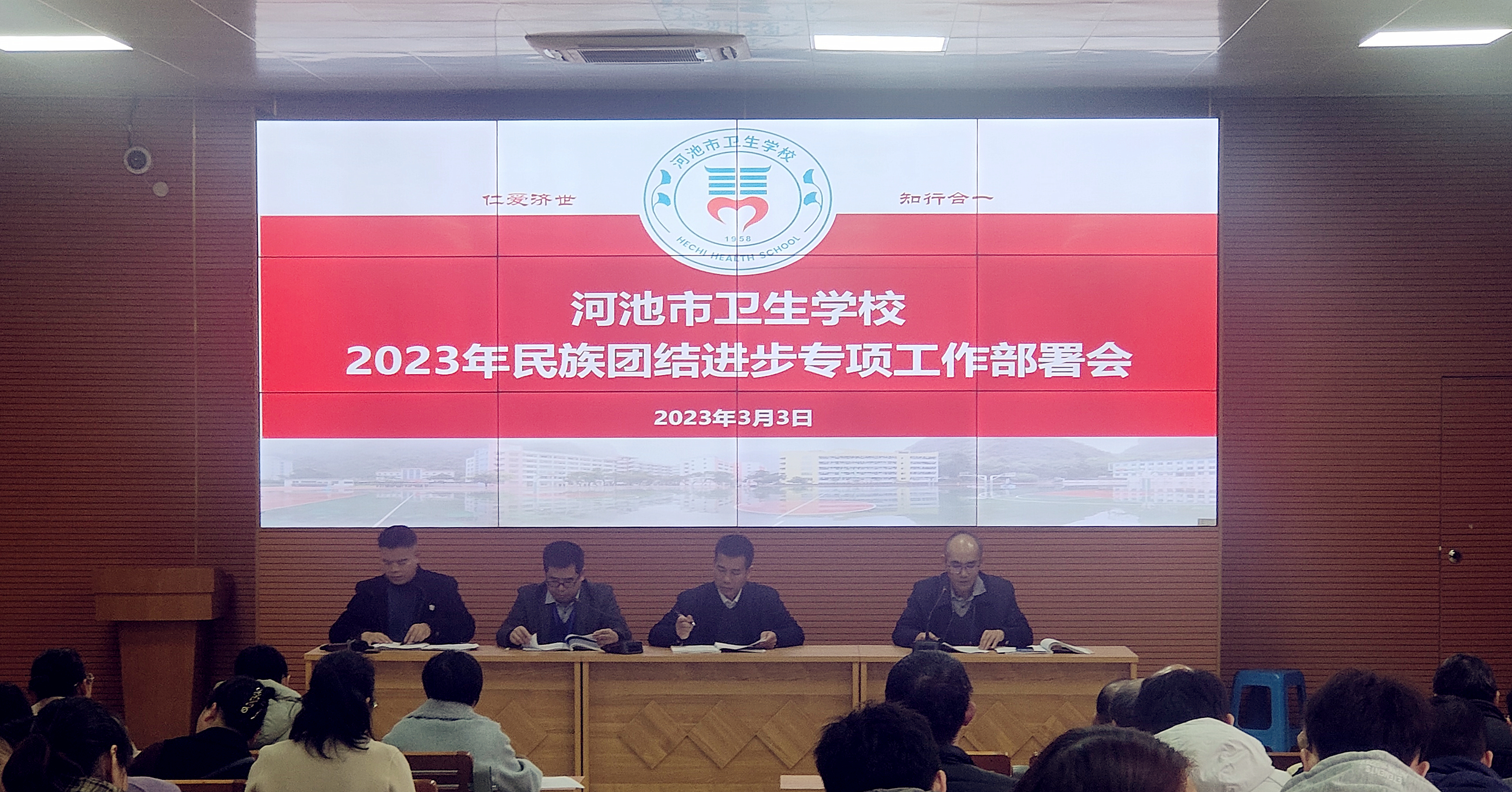 2023年3月3日,河池市卫生学校组织召开2023年民族团结进步专项工作部署会,全体教职工参加本次会议。