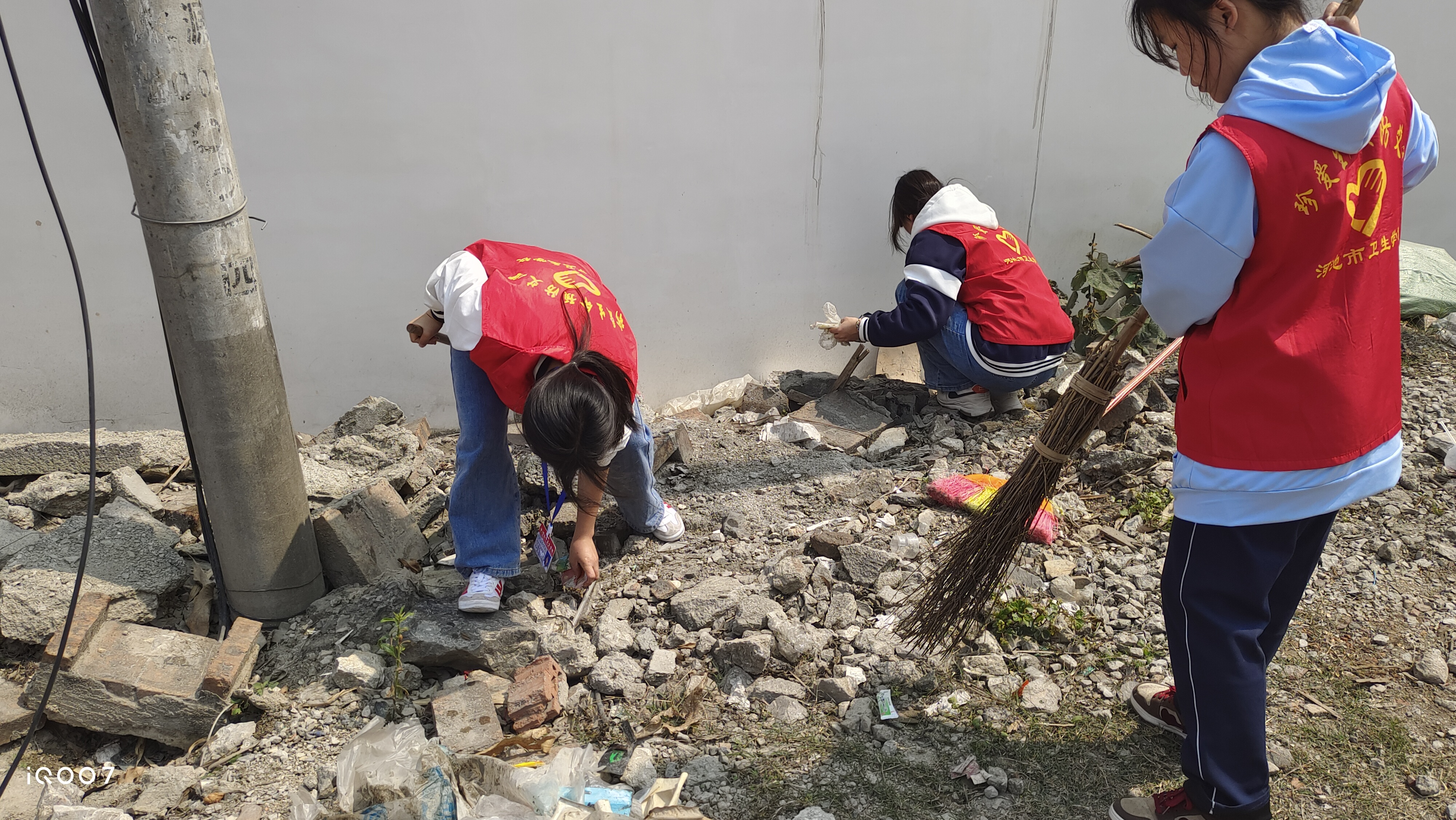 志愿学生认真清理卫生死角