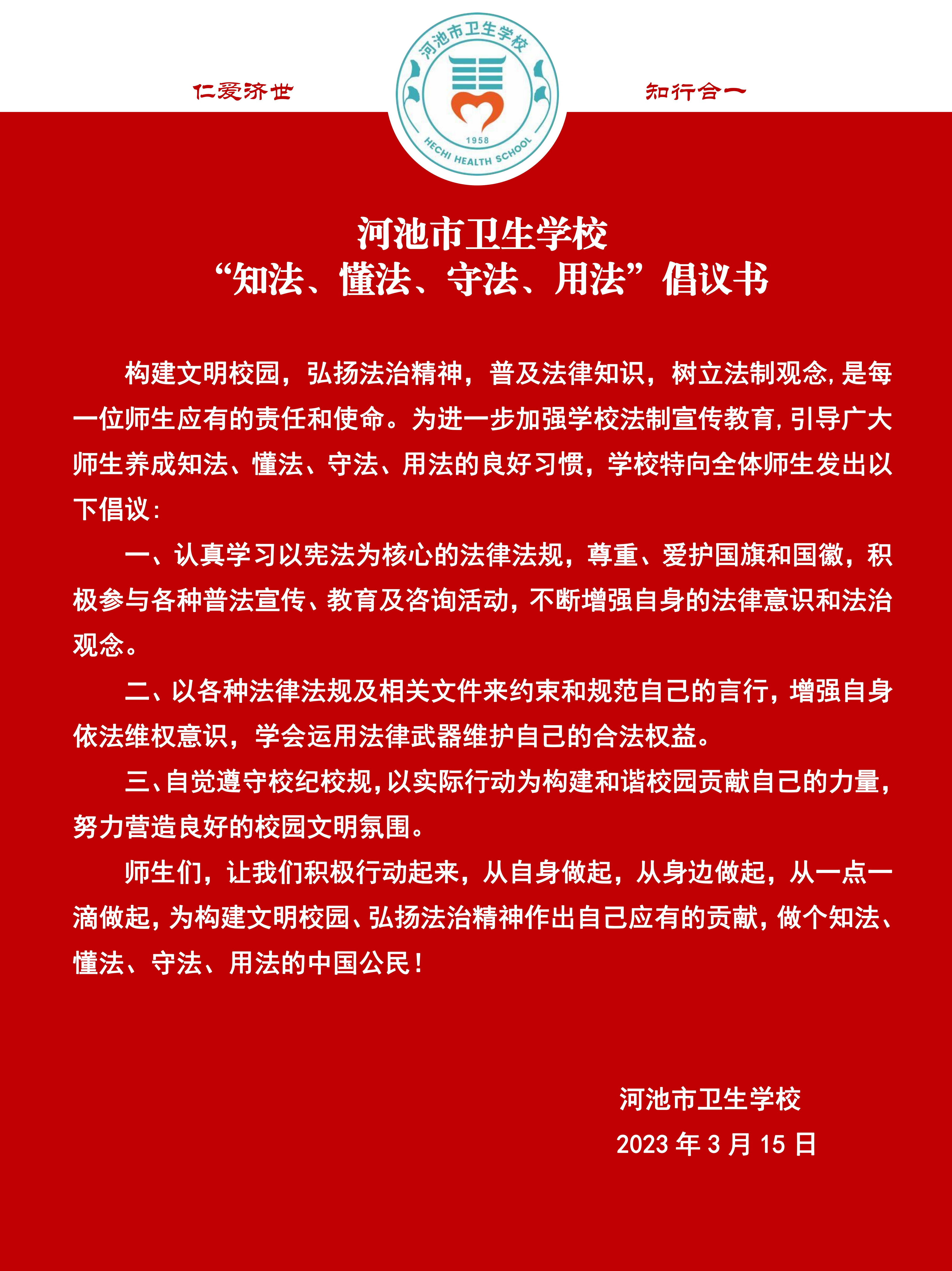 河池市卫生学校“知法、懂法、守法、用法”倡议书