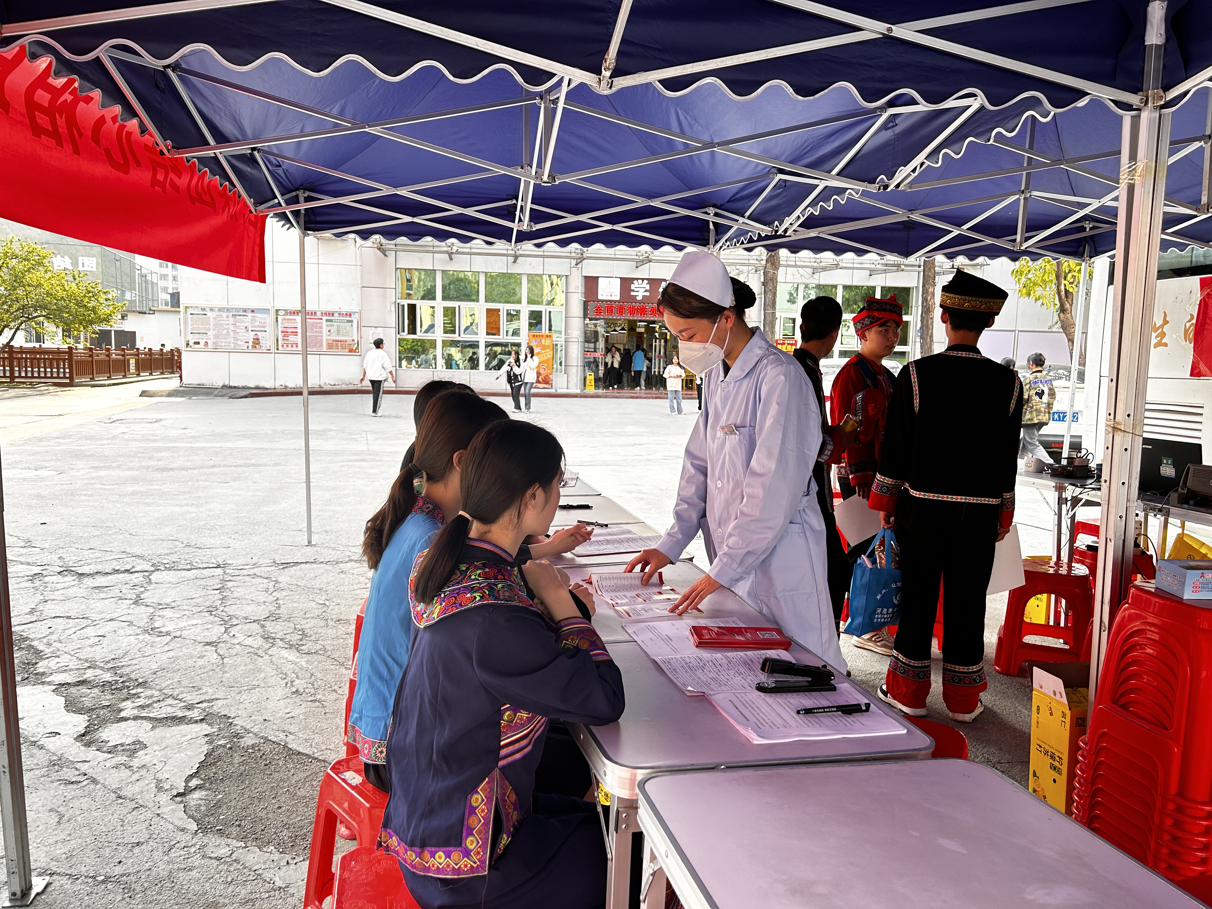 2023年3月21日,河池市卫生学校联合河池市中心血站在校园内开展“民族团结心相印 无偿献血传温情”献血活动。