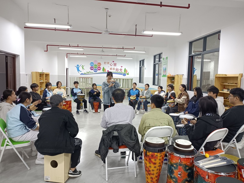 心理健康发展中心石华老师首先介绍鼓圈的起源、发展、作用,然后简单演示每一件乐器的使用方法,参与活动的师生们从熟悉各自手中的乐器入手,轮流上场扮演鼓圈引导师,虽然经验不足,动作生疏,甚至节奏感不强,但他们都渐渐的投入到音乐的集体演奏中,体会到酣畅淋漓的宣泄感。