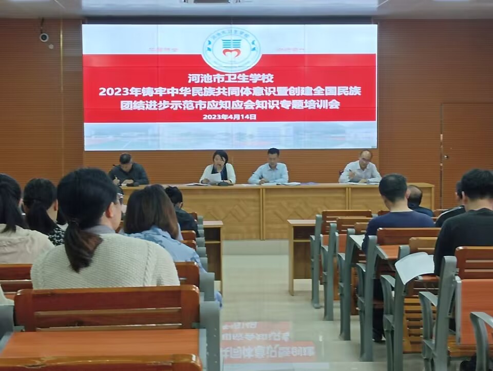 为深入学习宣传贯彻党的二十大精神,助力河池市创建全国民族团结进步示范,河池市卫生学校于2023414日组织全体教职工组织开展铸牢中华民族共同体意识暨创建全国民族团结进步示范市应知应会知识专题培训会。