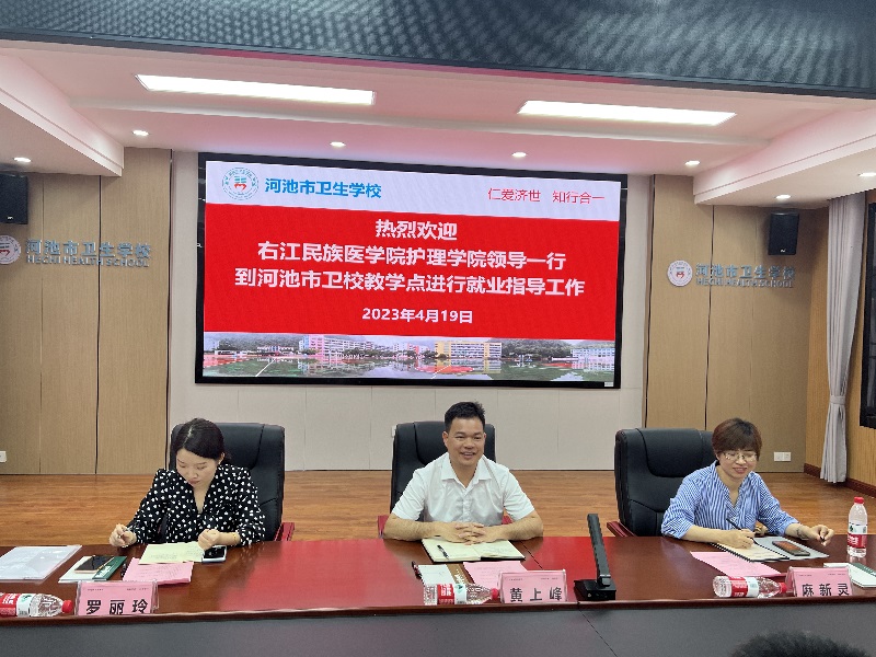 近日,右江民族医学院护理学院党委副书记黄上峰、科研与研究生管理科科长麻新灵、辅导员罗丽玲一行三人到河池市卫生学校开展高职毕业生就业推进会。河池卫校校长陈朝亮,副校长莫苗、周轩,招生就业办公室主任黄鸿宇及班主任代表出席会议。