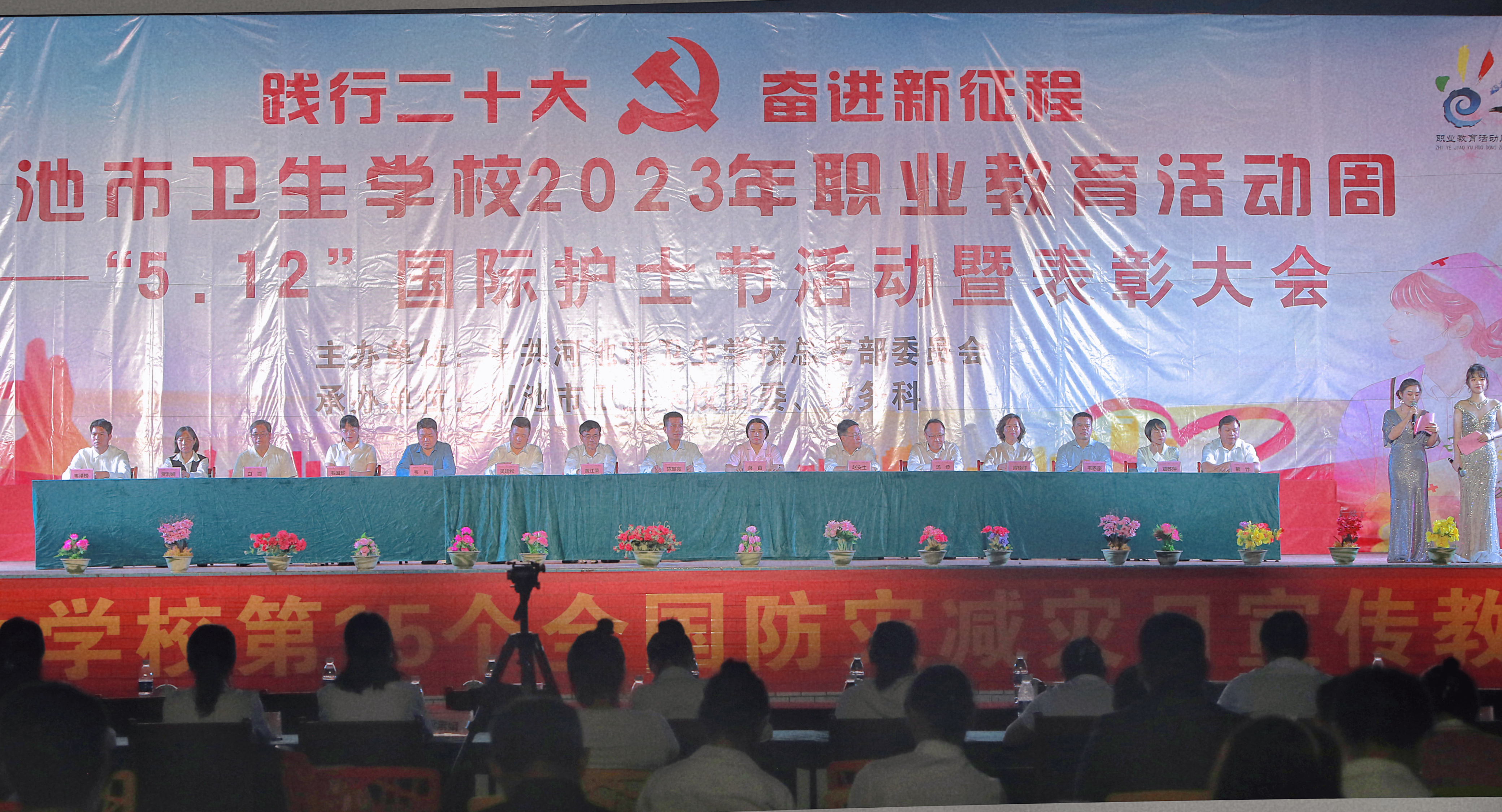 为庆祝“5·12”国际护士节,5月12日晚,河池市卫生学校在田径运动场举办了“践行二十大 奋进新征程”2023年职业教育活动周——“5·12”国际护士节暨表彰大会。河池市卫生监督所副所长吴建松、河池市疾病预防控制中心主任黄江荣及其护理团队、河池市中心血站站长赵安生及其护理团队、河池市卫生学校党总支书记、校长陈朝亮以及全体师生参加了活动。