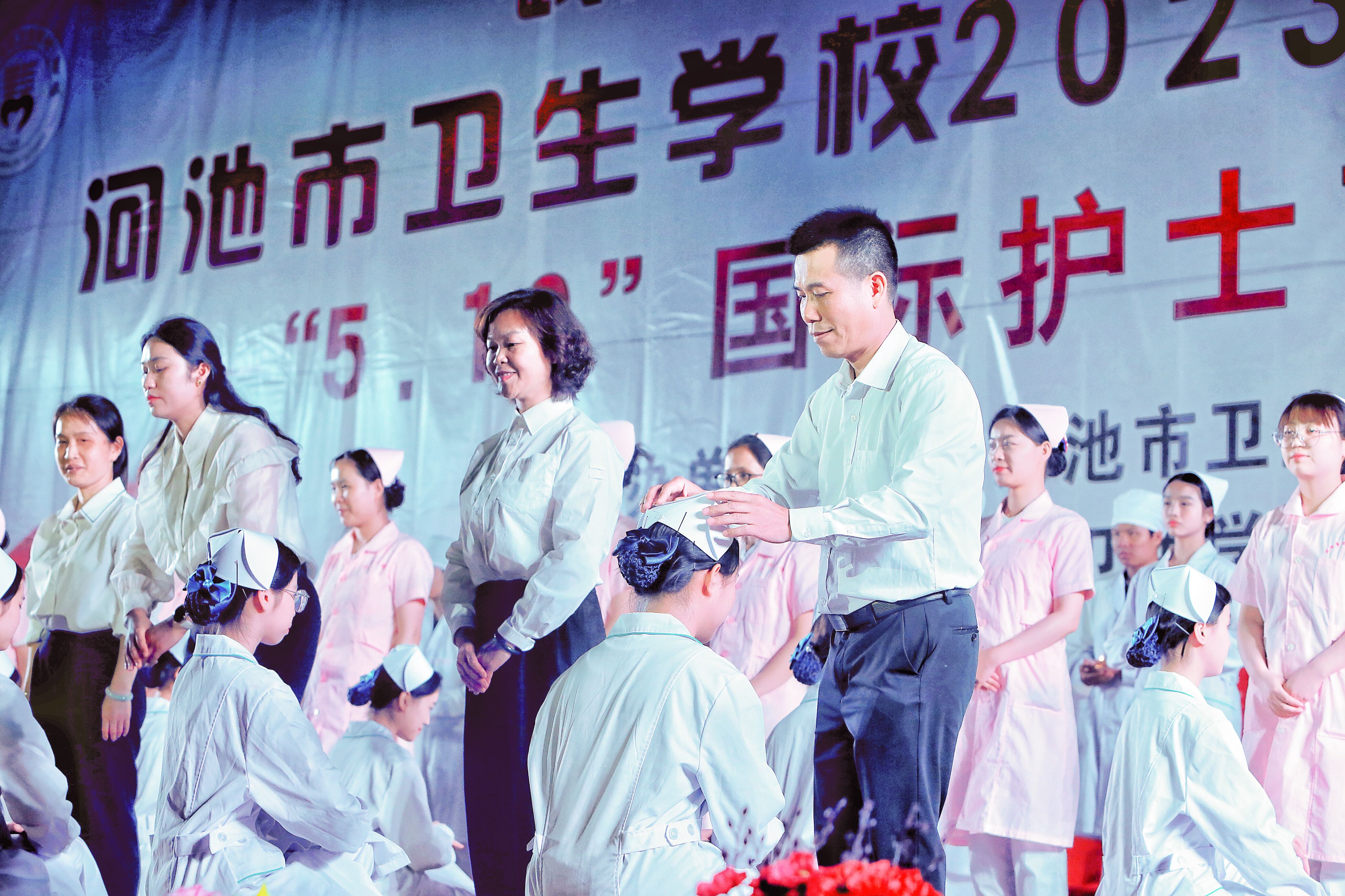 随后,庄严而神圣的授帽仪式开始了,学校领导和河池市疾病预防控制中心护理前辈以及河池市中心血站护理前辈们为护理专业学生们代表戴上神圣的燕帽。学生们接过前辈们手中的蜡烛,在莫苗副校长的带领下重温《南丁格尔誓言》。