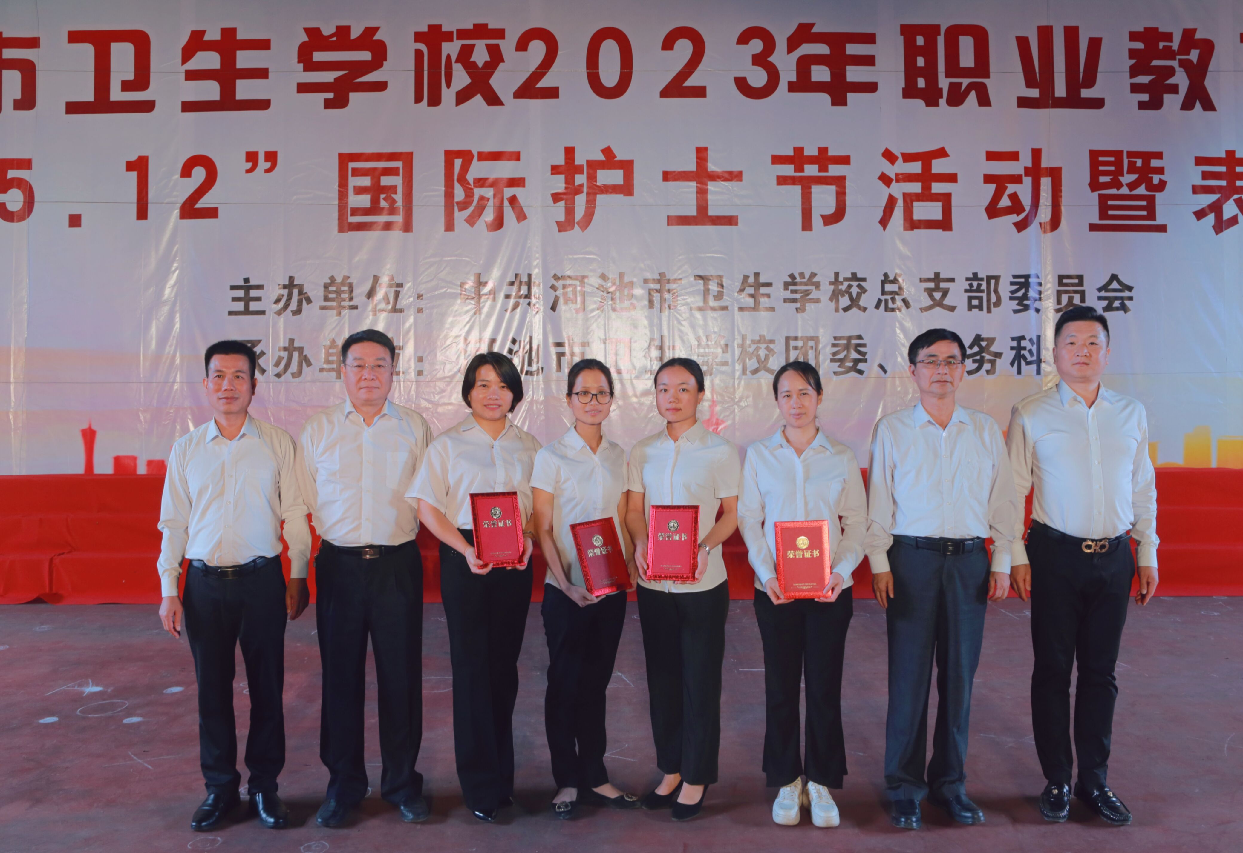 学校党总支书记、校长陈朝亮和河池市疾病预防控制中心主任黄江荣(右二)、河池市中心血站站长赵安生(左二)、河池市卫生监督所副所长吴建松(右一)给获奖老师颁奖