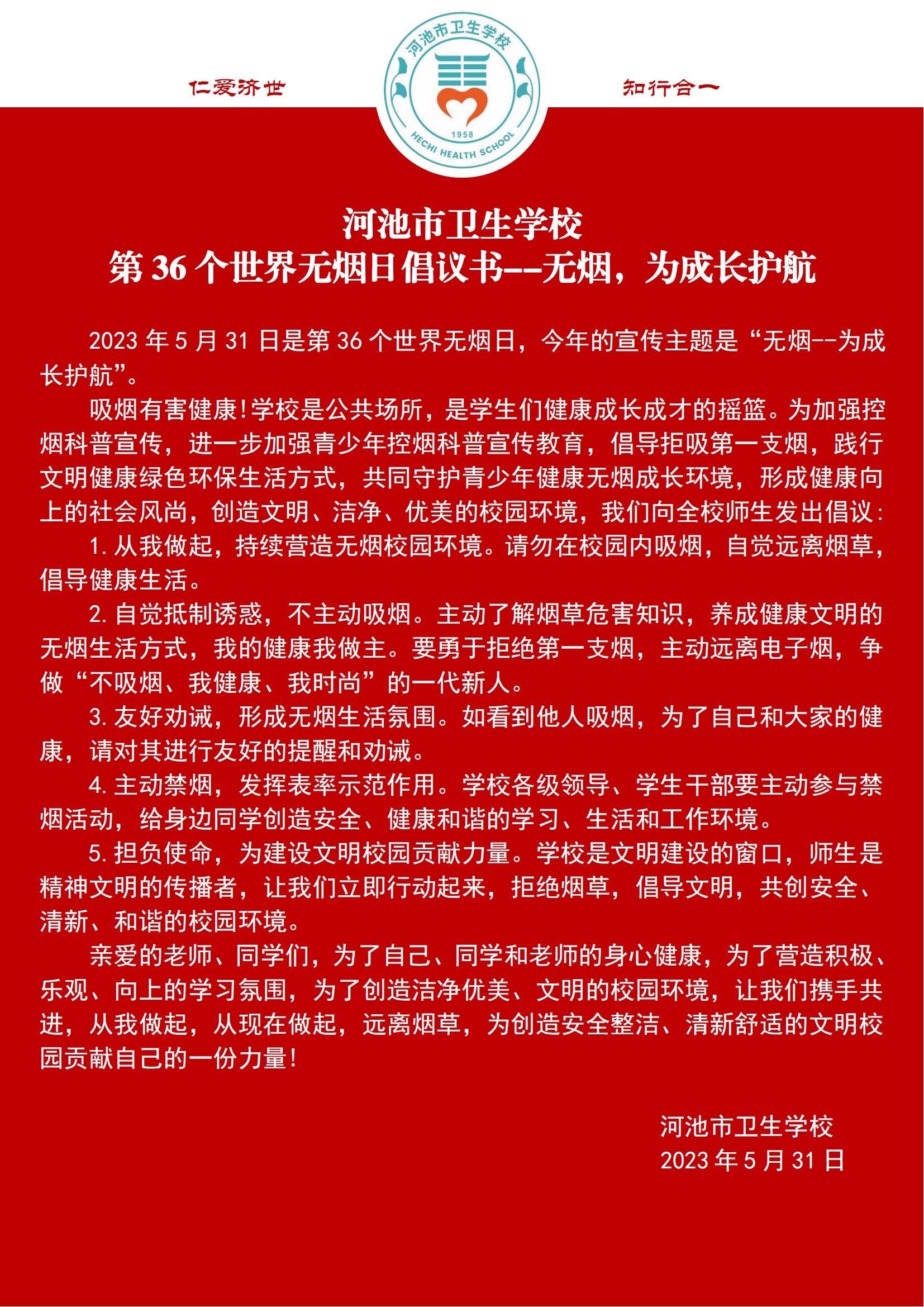 河池市卫生学校第36个世界无烟日倡议书--无烟,为成长护航