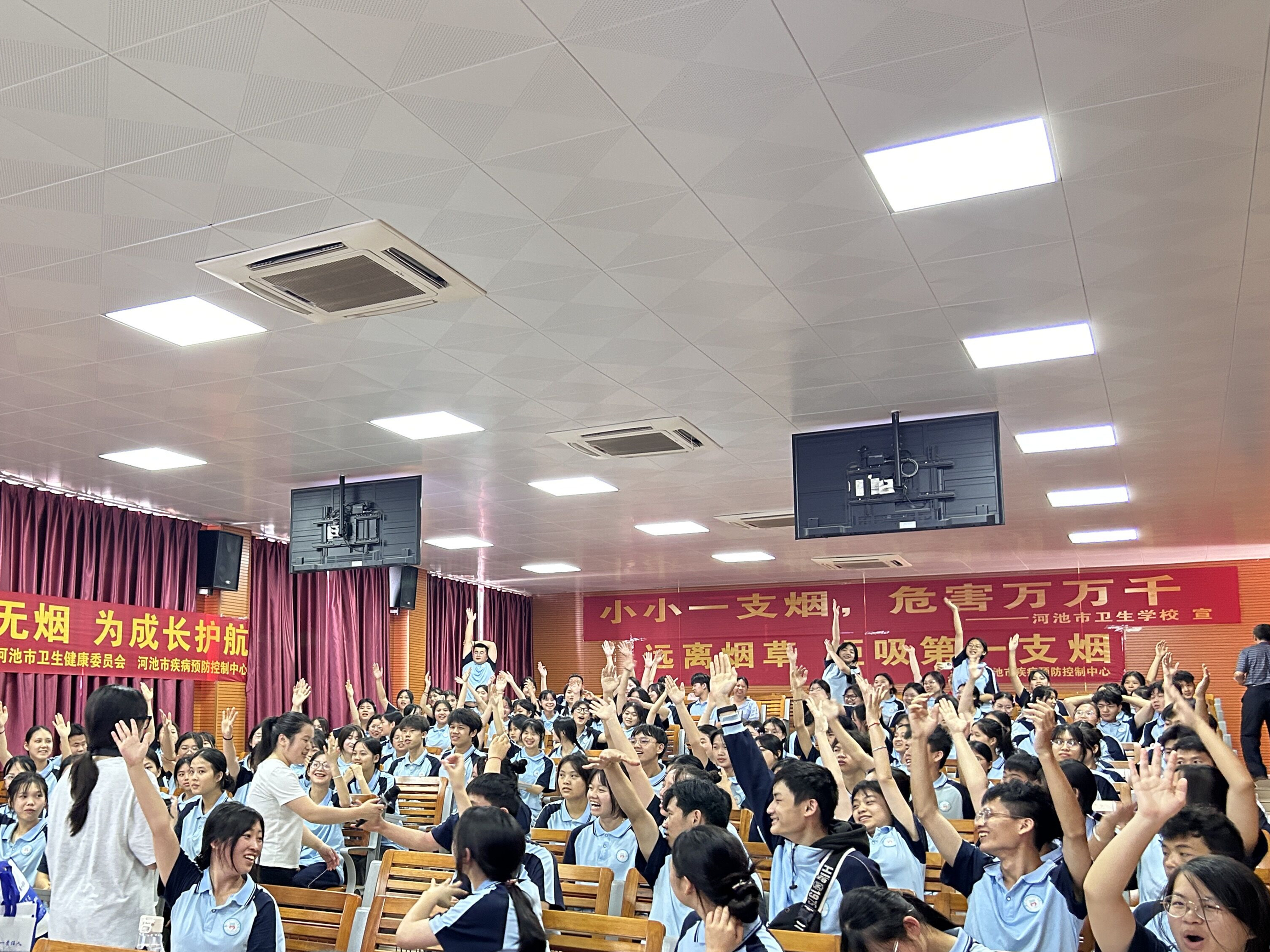 5月30日,学校联合河池市卫健委、教育局、疾控中心共同举办第36个世界无烟日主题宣传活动(校园专场),活动内容丰富多彩。首先,是河池市中医医院肺病科主任覃露海医生带来的控烟知识专题讲座;讲座围绕就吸烟对生命健康、自然环境的危害作具体描述,特别强调了吸烟对青少年的严重危害:影响肺脏发育,造成智力损伤和记忆力减退,易诱发身体疾病和不良行为习惯等,号召大家珍视生命健康,保护环境健康,远离烟草危害。讲座过后,是有奖问答环节,根据覃露海医生所传递的禁烟相关知识进行问答,同学热情高涨,积极参与,答题正确率高,多位学生获得了卫生健康小礼品。接着,开展了“无烟 为成长护航”学生签名活动,学生们纷纷在宣传横幅上留下自己的名字并表示,作为卫校学子,要时刻警惕吸烟的危害,坚决拒绝第一支烟,坚决拒绝吸二手烟,当好禁烟的实践者和倡导者。活动最后,学生们亲手写下对吸烟长辈的“戒烟信”并在微信朋友圈积极转发禁烟知识,希望更多的人关注烟草危害,增强责任感和自我控制能力,为自己和家人健康保驾护航。