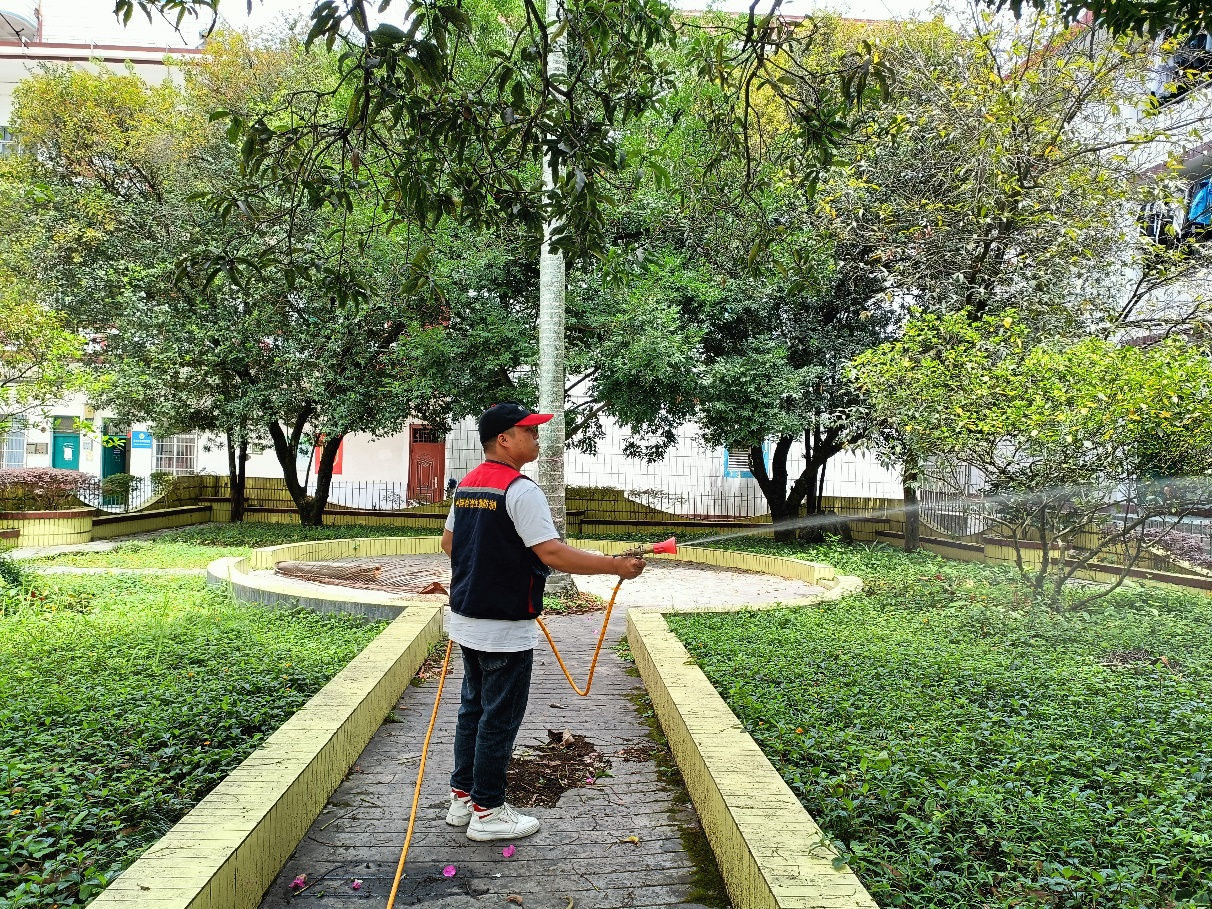 专业人员选用“杀菌力强、消灭病毒时间短、对人体安全无毒”的消杀雾剂,用背负式喷雾器、热烟雾机、机动喷雾器对教学楼、宿舍楼、食堂、花坛周边、树木和绿化带等区域开展消杀作业,同时还对下水道、排水沟等容易滋生病媒生物的重点部位进行地毯式的药物喷洒和消杀,沿建筑物、围墙边等容易出现老鼠和蟑螂的地方布置鼠盒、毒饵盒,投放鼠药并做好标记。