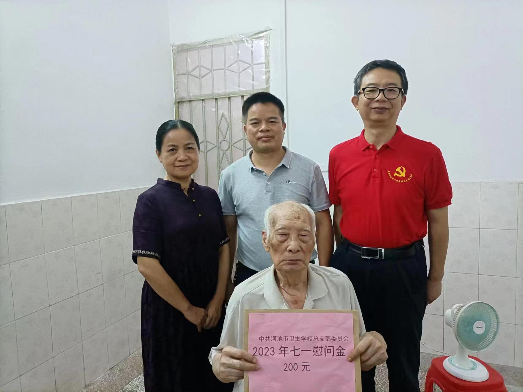在第102个“七一”建党节即将来临之际,为加强党内关怀,传递组织温暖,6月29日,河池市卫生学校党总支组织委员韦恩豪、退休支部书记石华、退休党员张红玲代表学校党总支开展慰问退休困难老党员活动。
