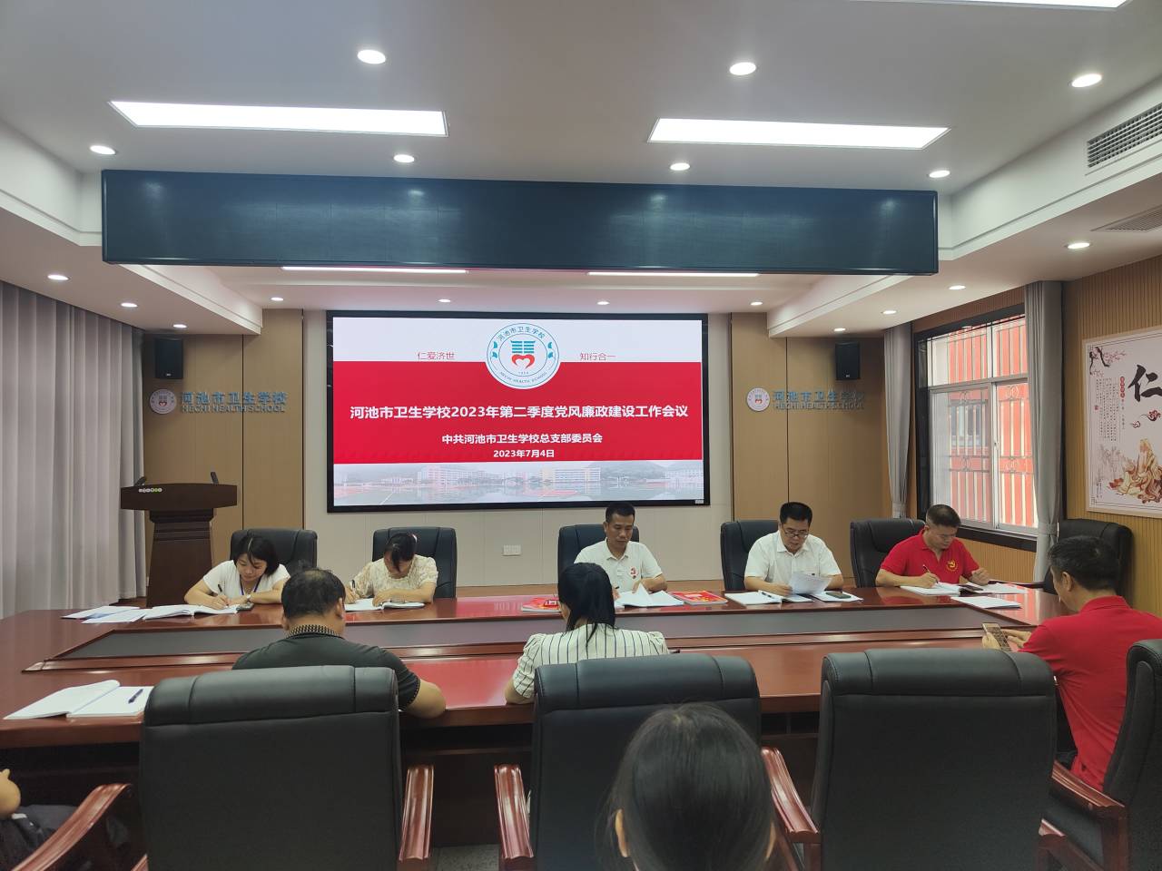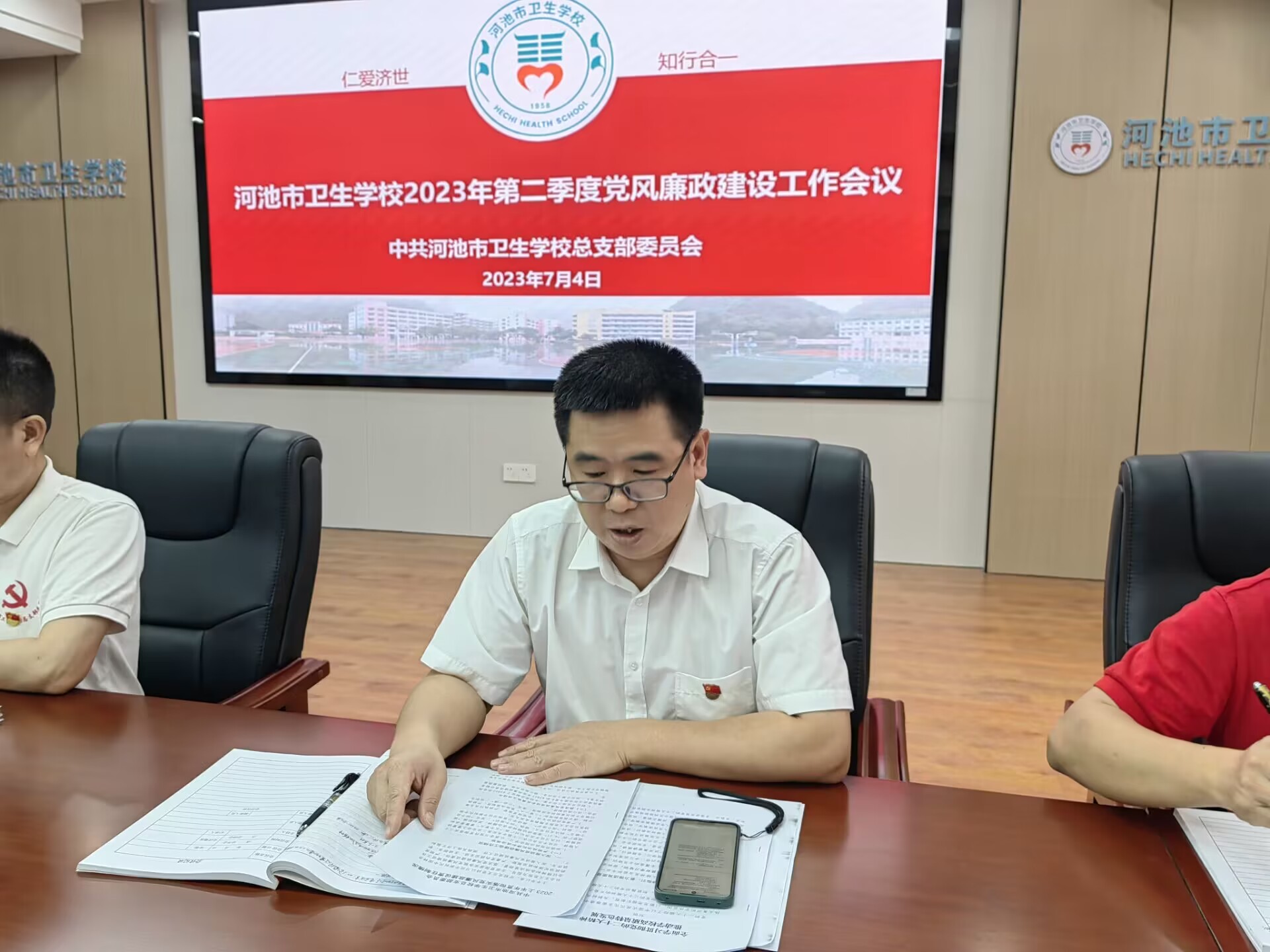 7月4日,河池市卫生学校召开2023年第二季度党风廉政建设工作专题会议。会议由党总支书记陈朝亮同志主持。各科室主要负责人、各支部支委参加会议。