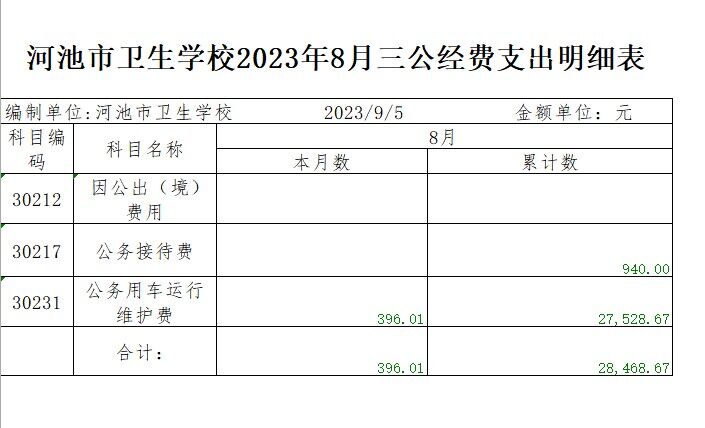 河池市卫生学校2023年8月三公经费支出明细表