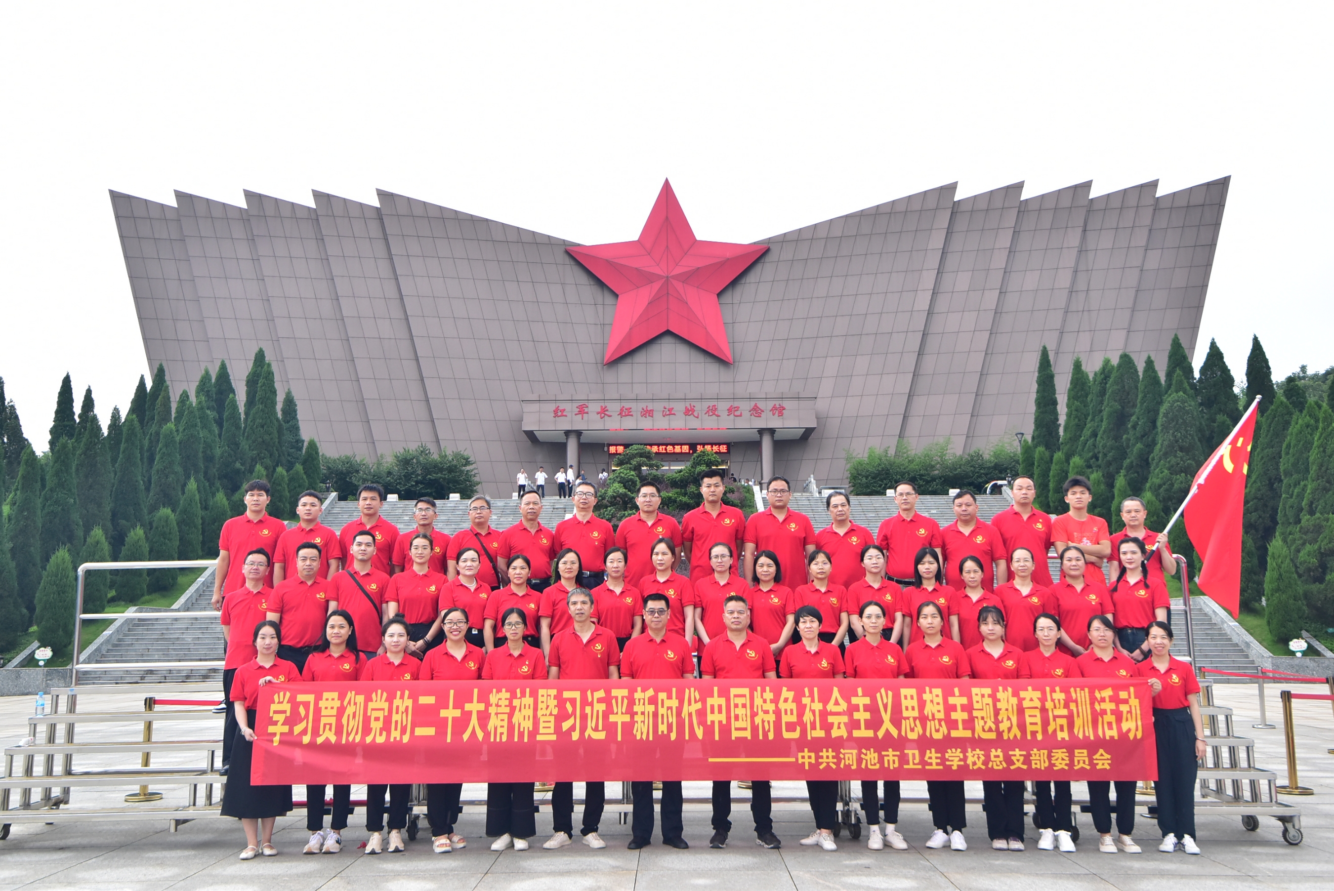 为进一步深入学习贯彻习近平新时代中国特色社会主义思想和党的二十大精神,激励全体教职工党员不忘初心、继续前进,从党的光辉历史中汲取精神力量。6月9日至11日,河池市卫生学校党总支组织全体教职工党员到湘江战役发生地桂林市全州、兴安、灌阳三县开展学习贯彻党的二十大精神暨习近平新时代中国特色社会主义思想主题教育培训活动。