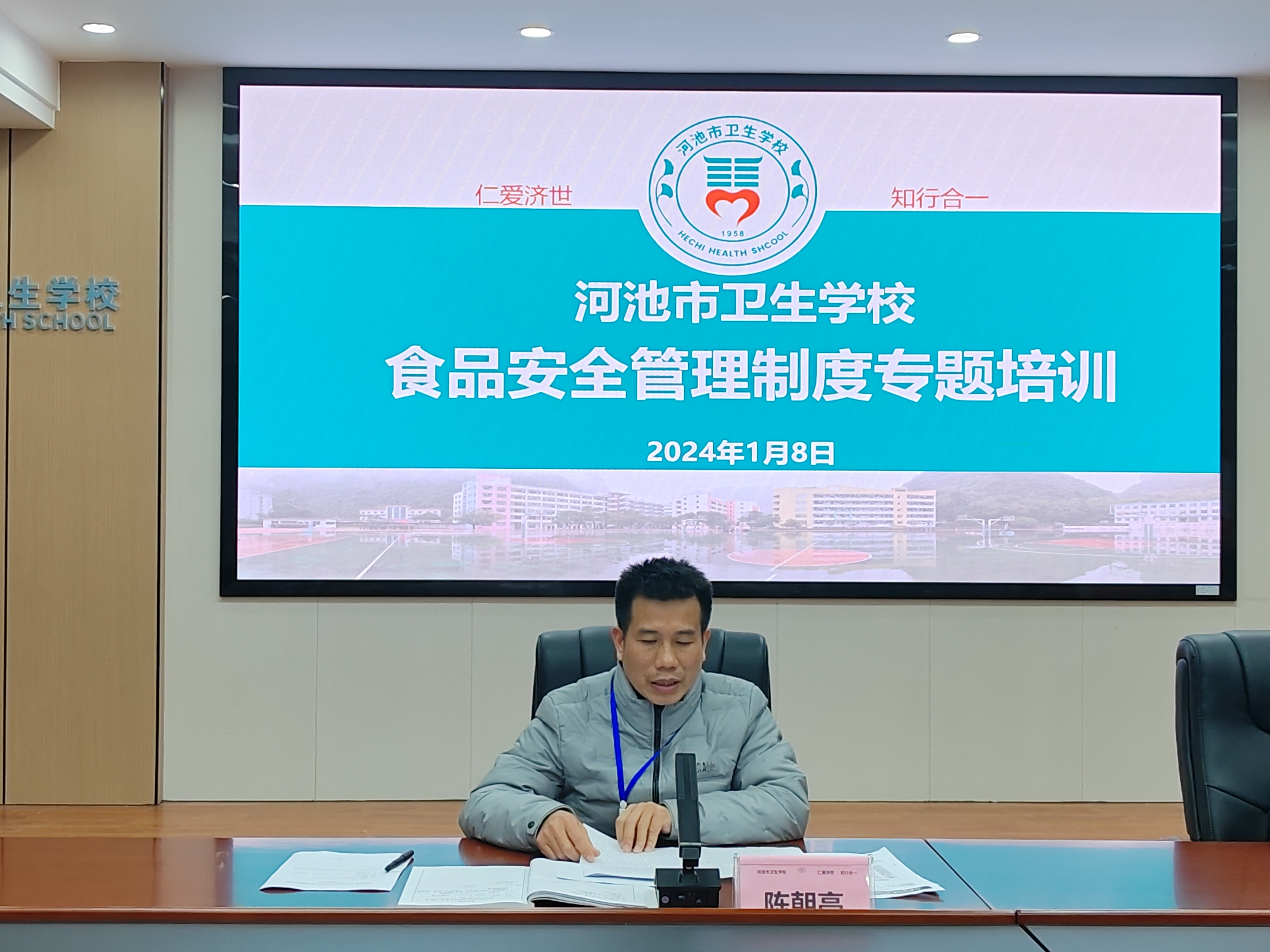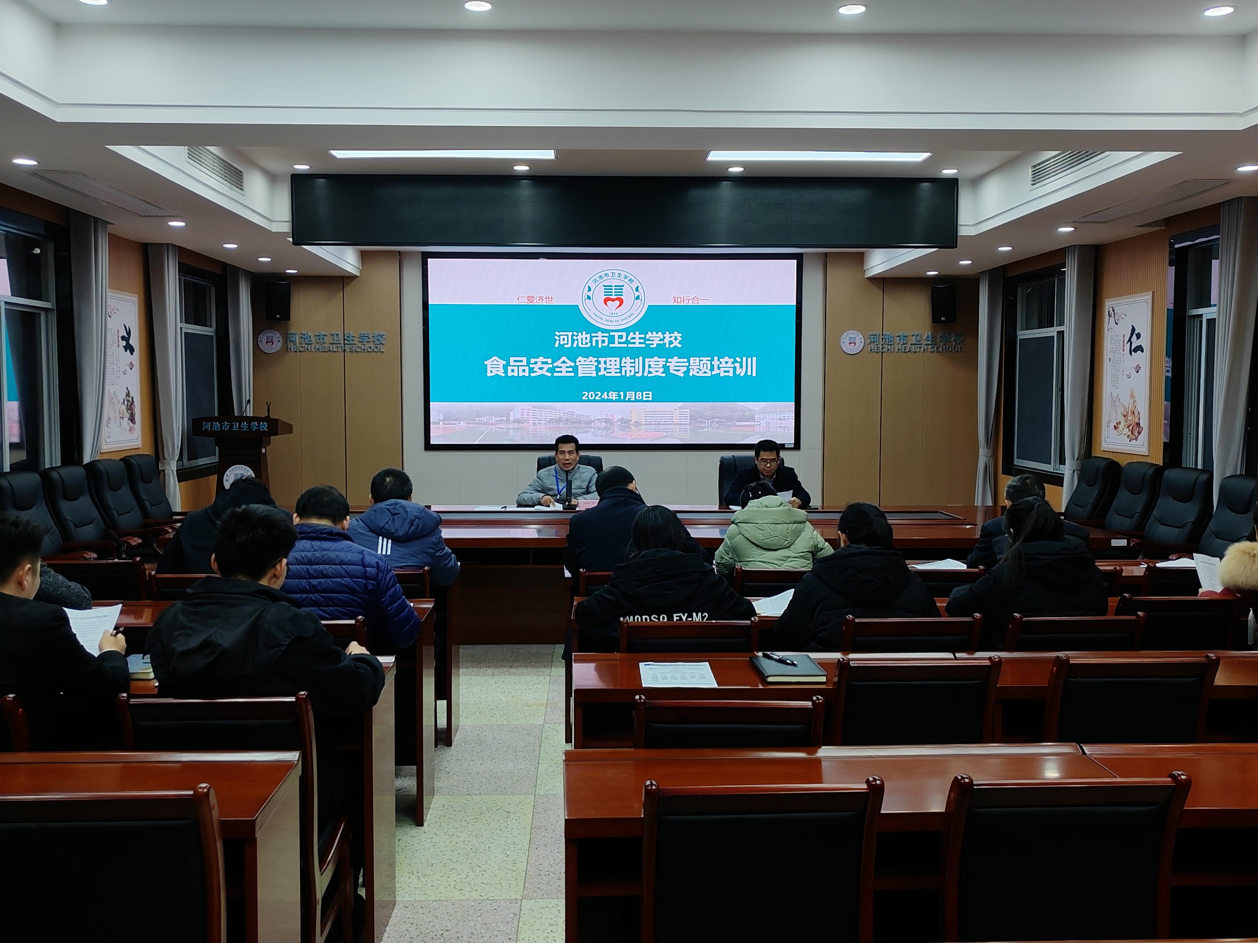 为进一步强化校园食品安全意识和责任,明确相关责任人的工作职责,确保学校师生就餐安全。2024年1月8日,河池市卫生学校召开了食品安全管理制度专题培训会。学校中层以上领导干部、校医、食堂管理员以及食堂经营从业者参加了会议。