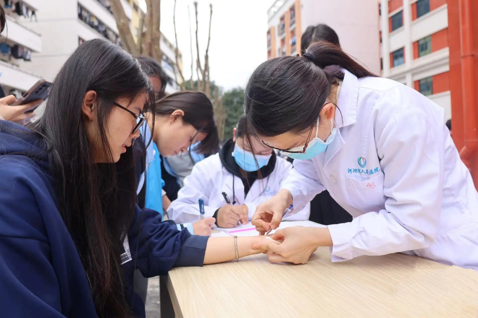 活动现场整齐摆放防结核宣传展板、设立咨询服务台,义诊专家从结核病传染源、传播途径、易感人群和防治等方面给学生们科普结核病防治相关知识,提高学生对结核病的危害和防治重要性的认识。此外,活动还以体格诊查、知识问答、发放宣传读本、免费测量血压和结核菌素皮肤筛查(PPD试验)等多种形式展开。现场师生排成多支队伍进行咨询,学习氛围浓厚。