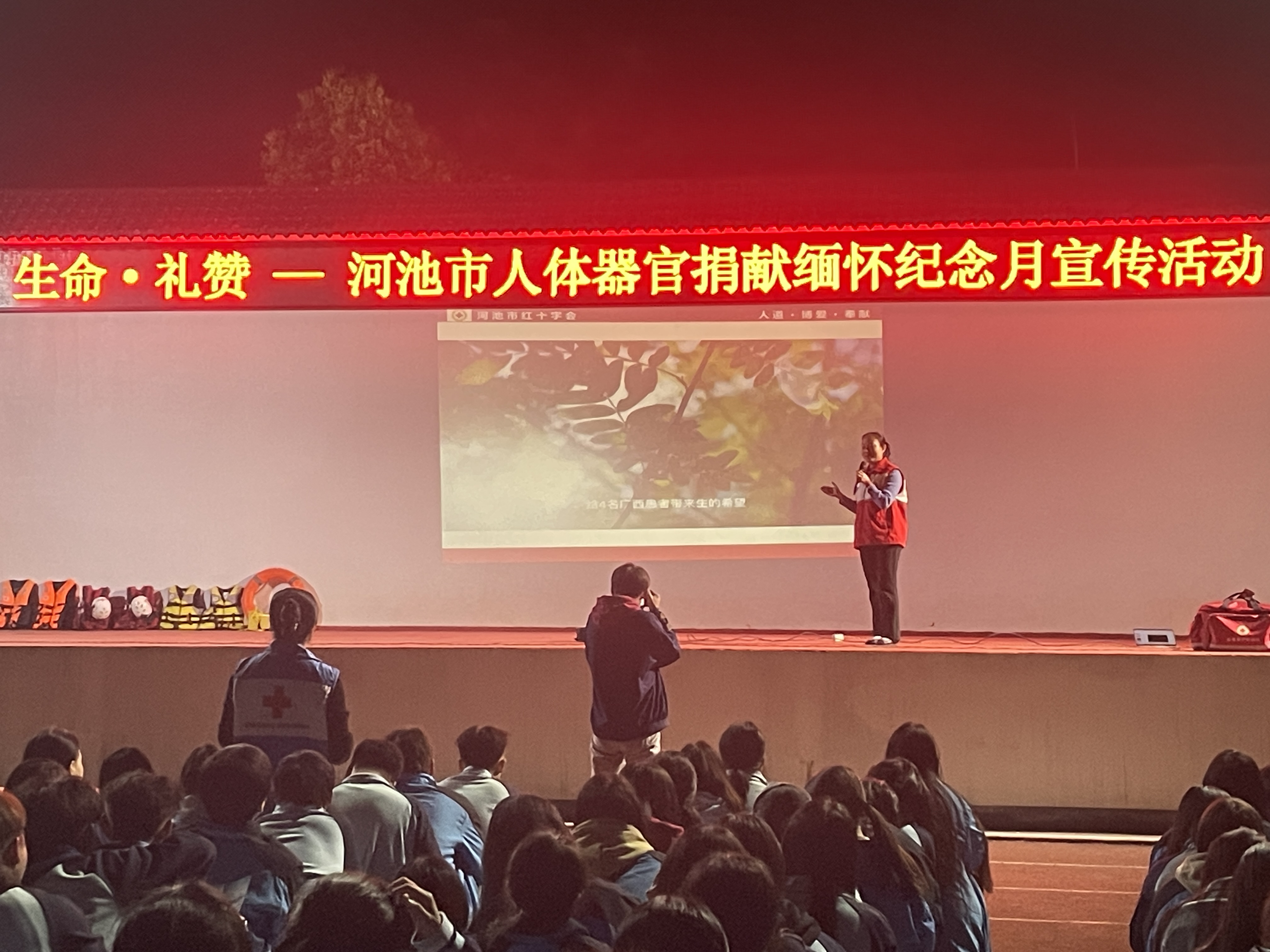 河池市红十字会张敏秘书长在会上进行了“生命•礼赞—河池市人体器官捐献缅怀纪念月”宣传,让同学们了解人体器官捐献的意义,传递爱心和希望,让生命在他人身上得到延续,推动器官移植事业的发展。