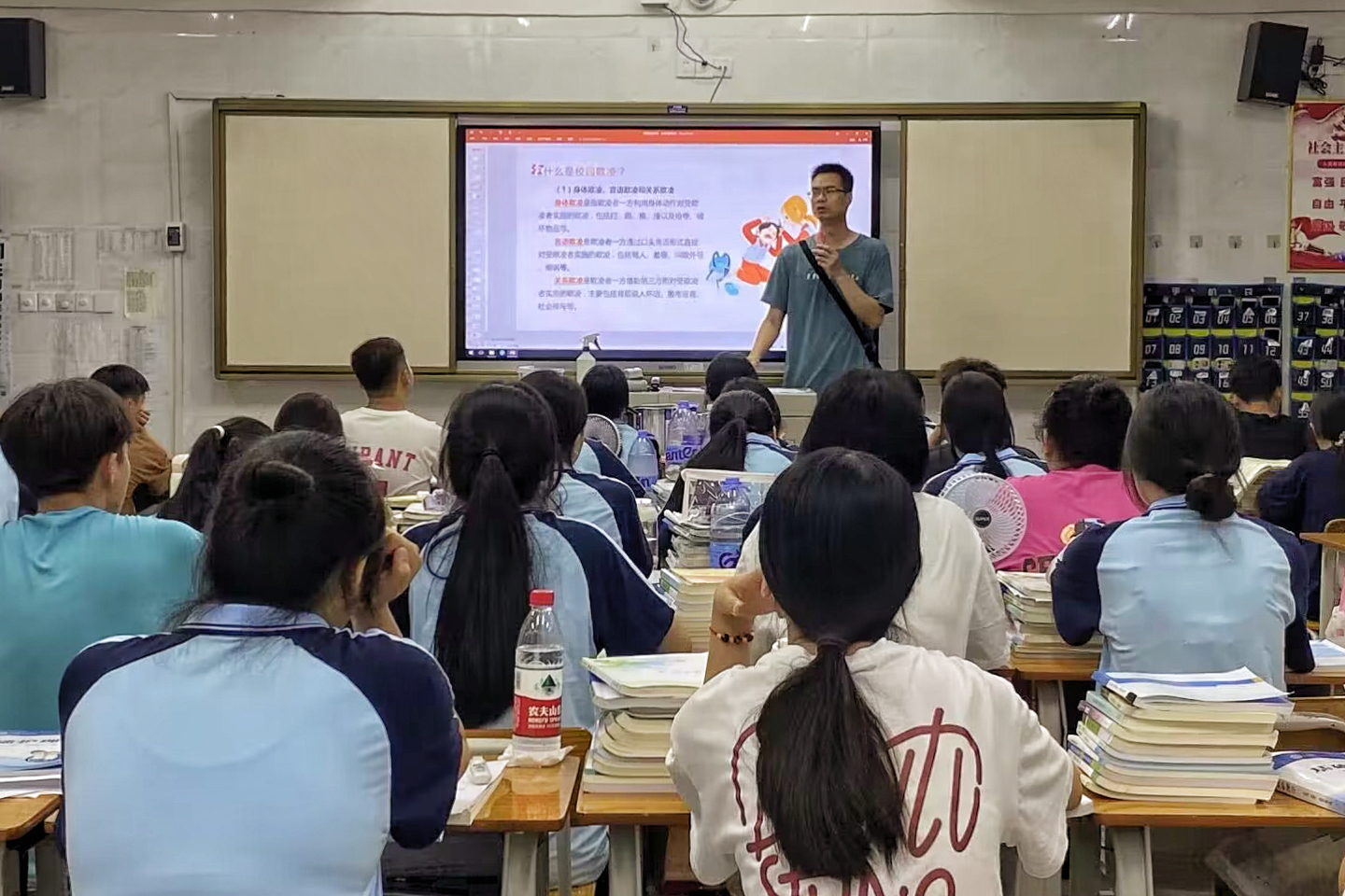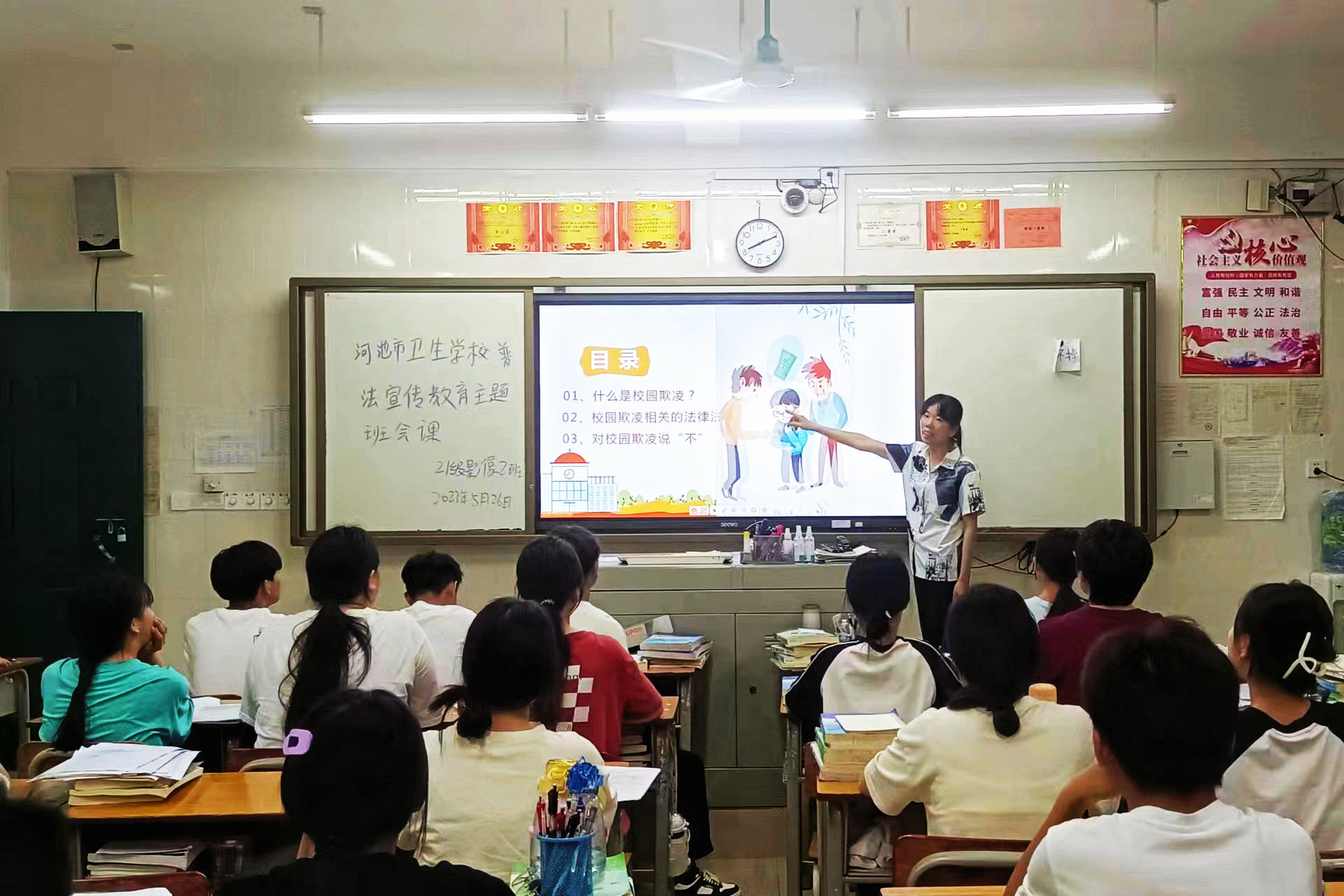 在主题班会课上,各班班主任通过案例分析的方式,向学生详细介绍校园欺凌的常识,让学生明确哪些行为属于校园欺凌,校园欺凌的危害有哪些;接着以法论事,向学生讲解校园欺凌所涉及的法律法规知识,并提出预防和减少校园欺凌的方法以及面对校园欺凌时可采取的措施;最后还引导教育学生,要自觉遵守法律法规,做有礼貌、懂团结、讲文明的好学生。