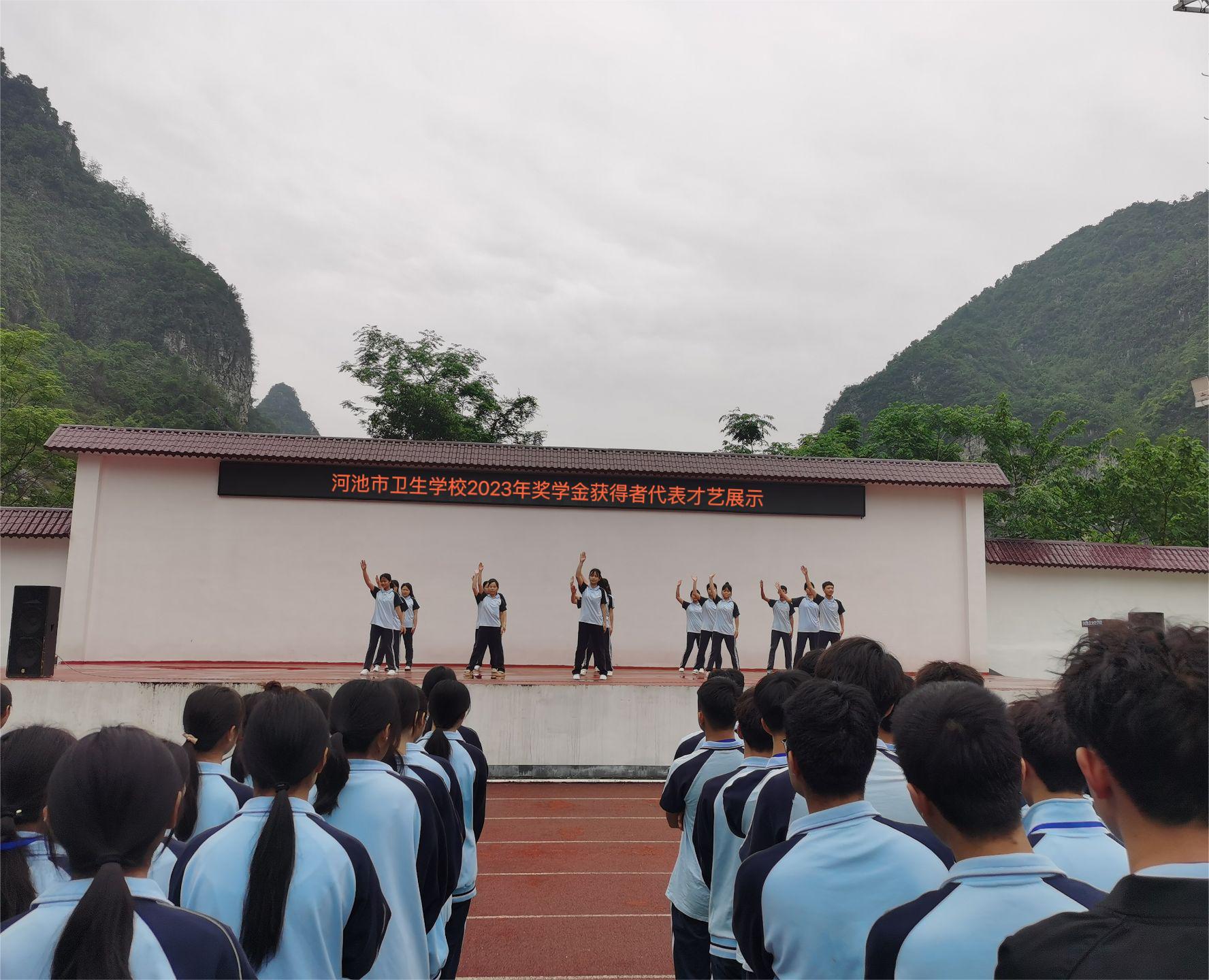 4月22日,河池市卫生学校获得2023年度中等职业教育国家奖学金、自治区人民政府中等职业教育奖学金、学校奖学金的16名学生代表进行才艺展示。