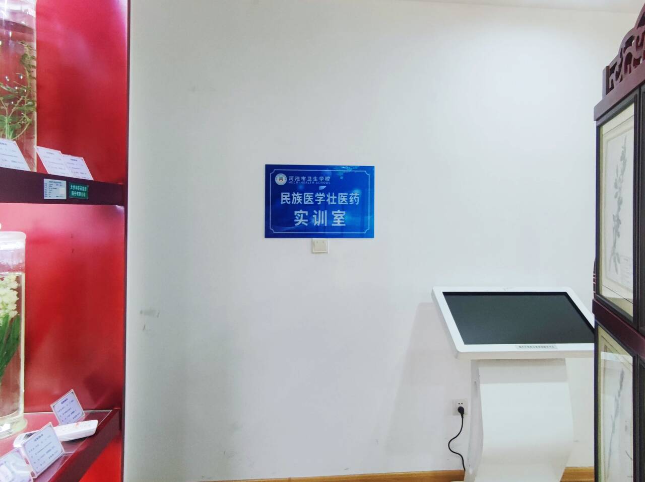 壮医药实训室主要以传统中药资源和民族壮药为特色,集中展示中医药与民族壮医药的悠久历史:实训室主要设有药材标本展示区、模拟药房区2个区域,收集了近五百种中药材标本并配以照片和文字说明。不仅凸显了民族药材浓郁的地域特色,更满足了学校教育教学、技能培训、科普宣传、对外交流等方面的需要,是具有民族医学特色的教学实训基地。