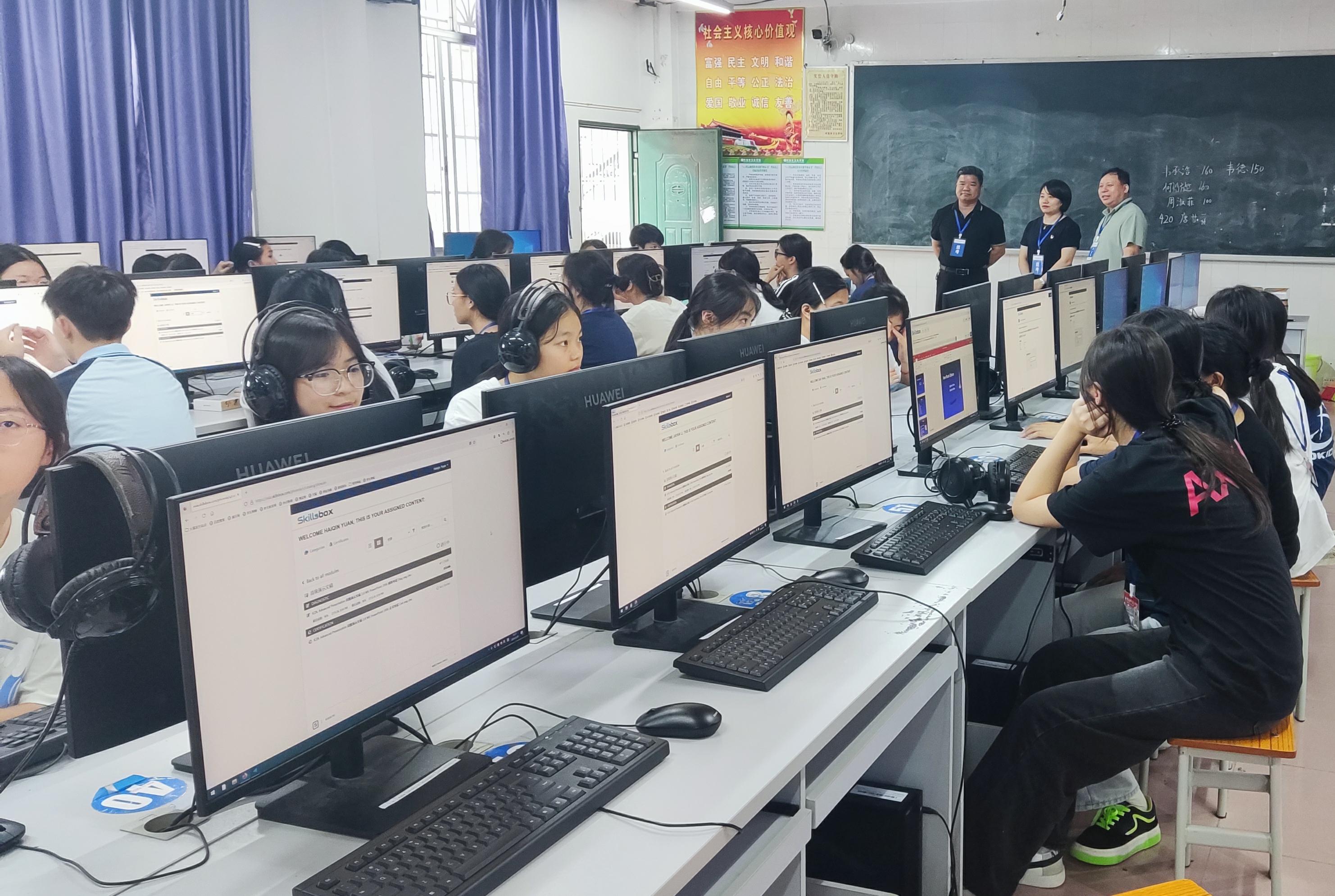上午10:30,ICDL《高级演示文稿》项目学生考试按时开始,河池市电化教育与学校装备管理站覃炳乾副站长和我校莫苗副校长负责巡考工作。