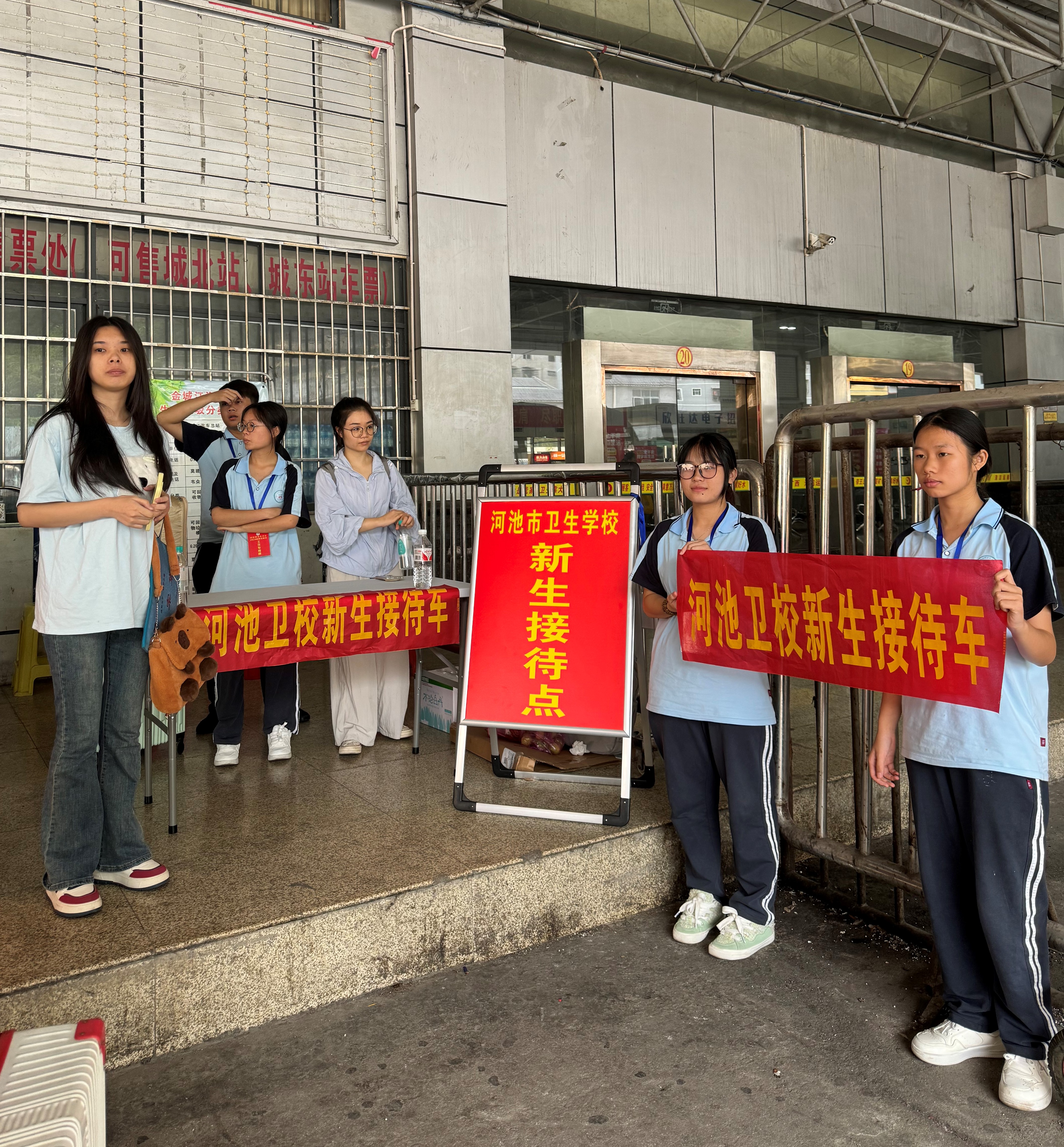 新生报到点设在学校食堂一楼,为了让新生和家长顺利进行报到,老师和学生志愿者们在西站、北站、环江站等各接站点,热情等候新生到来,为他们踏入卫校的第一站保驾护航。同时,学校还在校园内安排志愿者进行引导,他们佩带新生接待工作专用牌,身穿学校志愿服,热情的为新生进行指引。