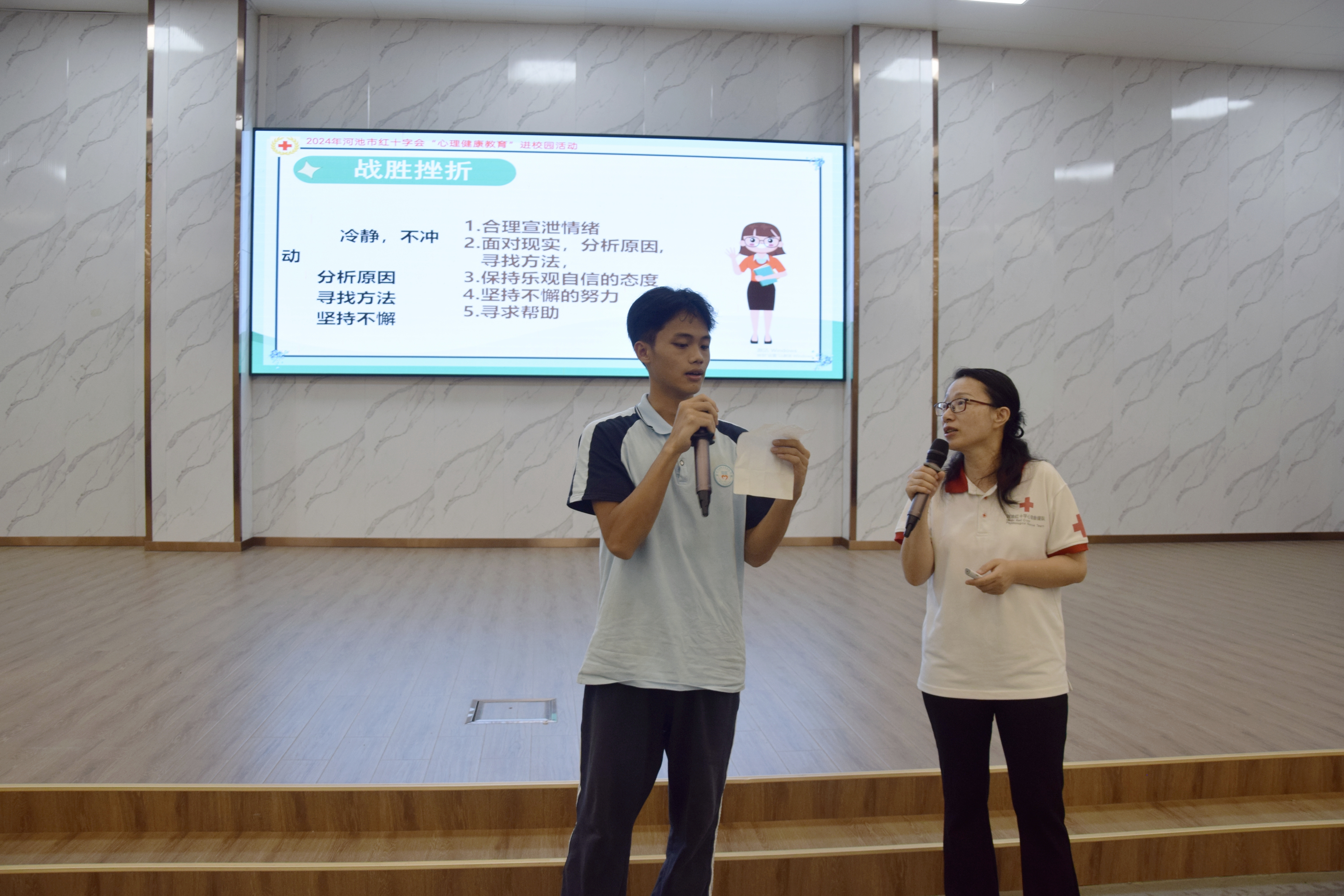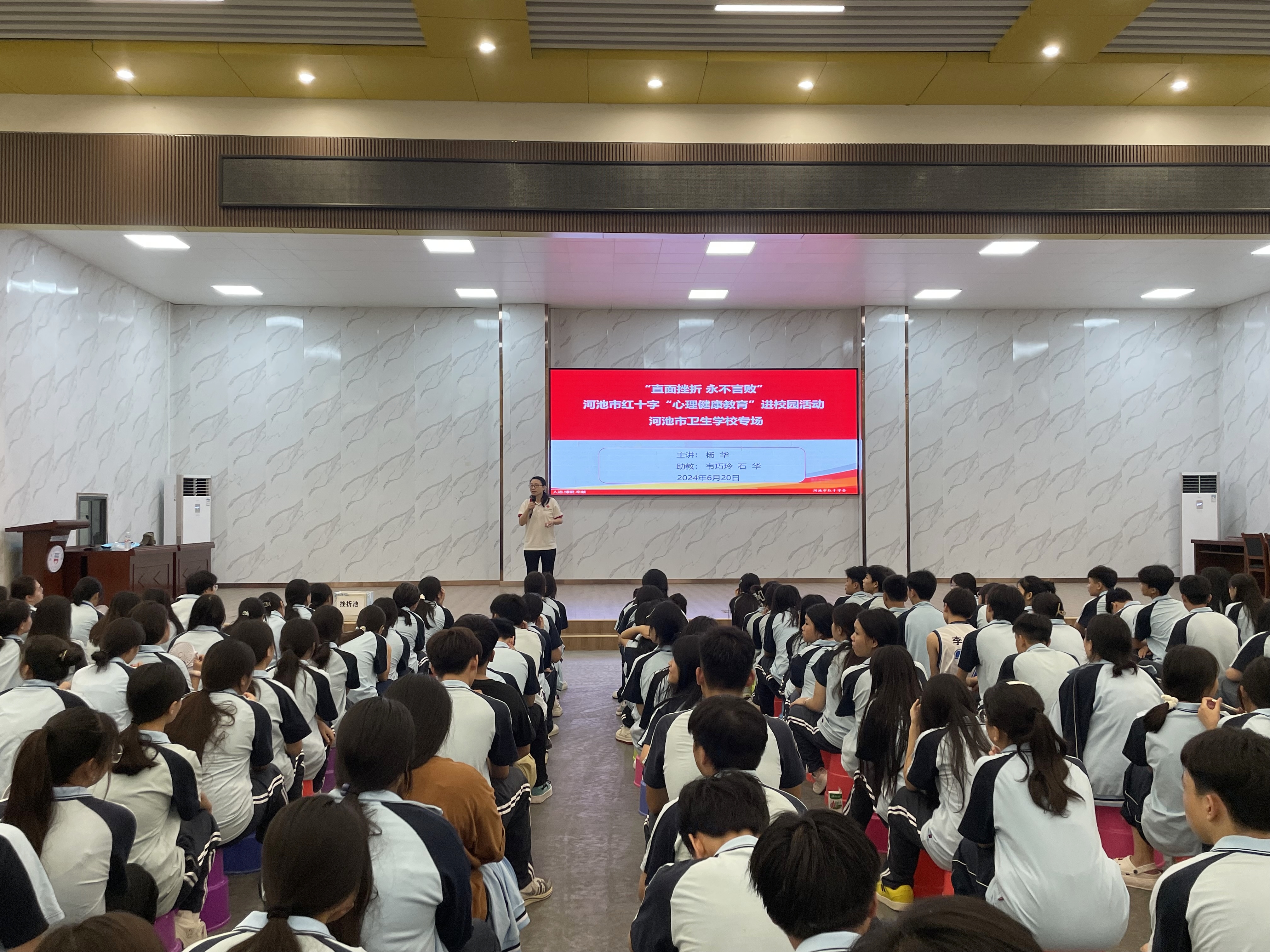 为引导同学们正确认识挫折,学会积极应对挫折,提升抗逆力,促进同学们自强、坚韧等积极心理品质的养成,2024年6月20日晚,我校特邀请河池市红十字会到校开展“直面挫折 永不言败”主题心理讲座,近260名不同专业的同学聆听了本次讲座。