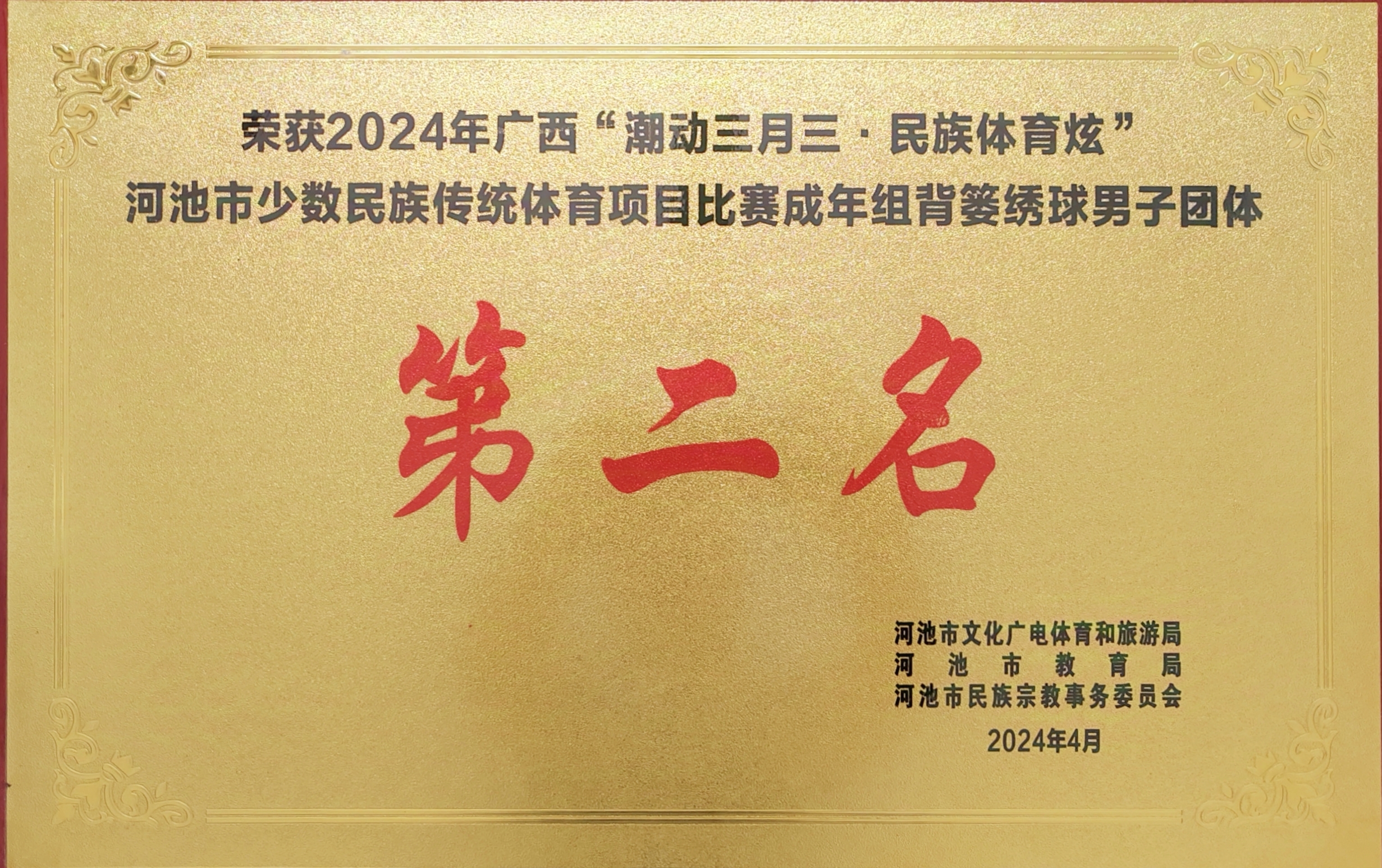 荣获2024年广西“潮动三月三,民族体育炫”河池市少数民族传统体育项目比赛成年组背篓绣球男子团体第一名-河池市文化广电体育和旅游局
