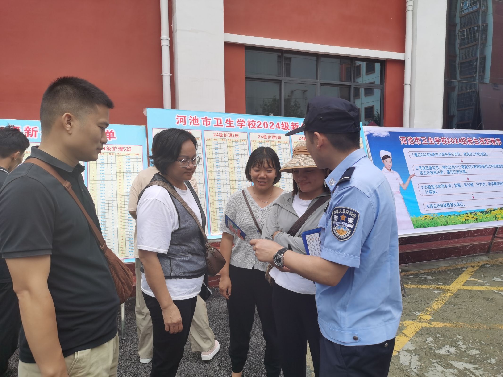 近日,金城江区东江派出所民警走进河池市卫生学校,开展2024年秋季学期“开学反诈第一课”宣传活动,全方面、多角度讲解反诈知识。