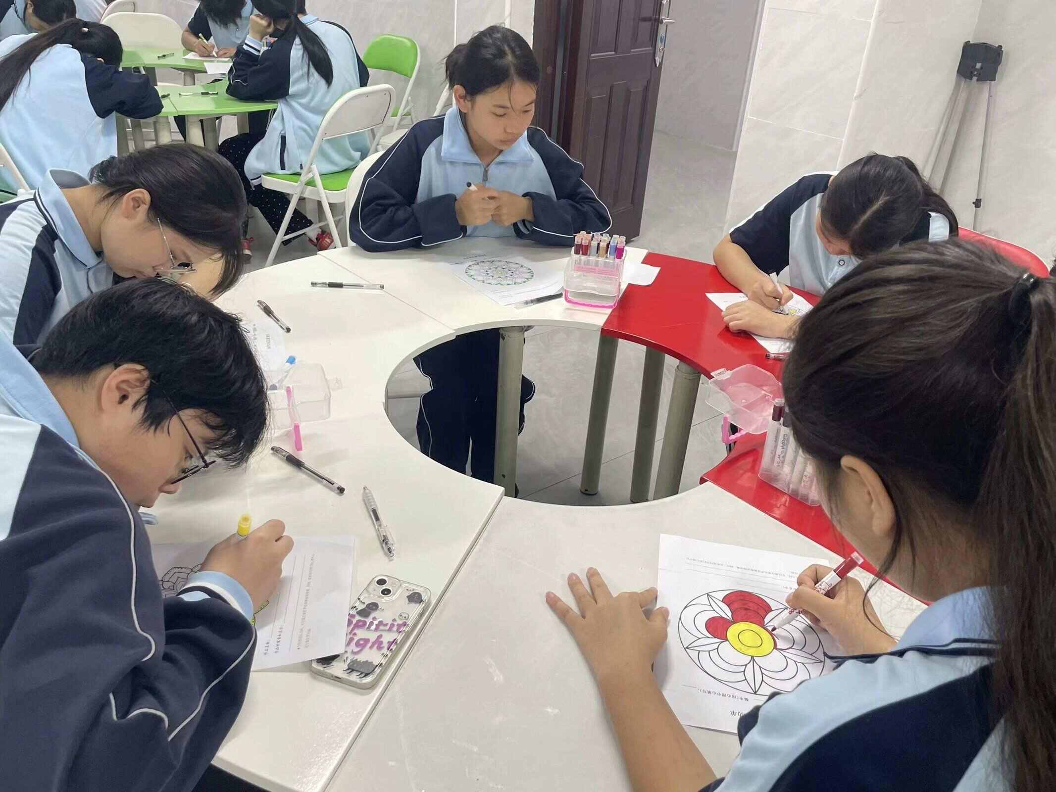 活动中,心理老师首先向参赛者介绍彩绘曼陀罗活动的意义和目的,让学生对艺术性表达、心理绘画尤其是曼陀罗绘画有初步的认识。伴随着舒缓的音乐,他们用不同的彩笔绘制出心中理想而美好的曼陀罗,充分抒发内心的情绪、表达潜意识的情感。最后学生分享感受并上交作品。通过活动,帮助学生了解自己内在真实的需求,看见自己疗愈自己焕发内在的喜悦,创造力和生命力,进一步了解和深入认识自己,提高专注力,表达和宣泄情绪,建立规则感和整合自我,探索生命潜能。