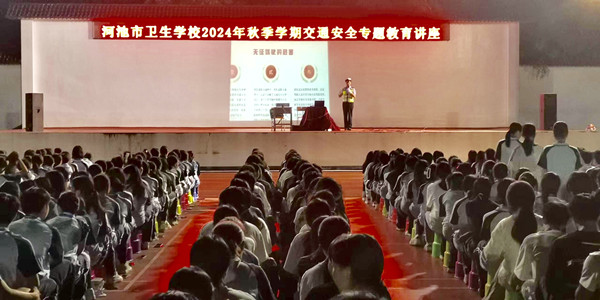 9月29日晚8点,河池市卫生学校于学校田径运动场开展交通安全专题教育讲座,学生科科长、全体班主任、全校学生约3000人参加。讲座由学生科副科长张乐平主持。