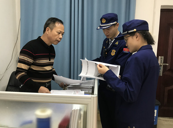 消防工作人员查阅学校消防安全管理工作档案