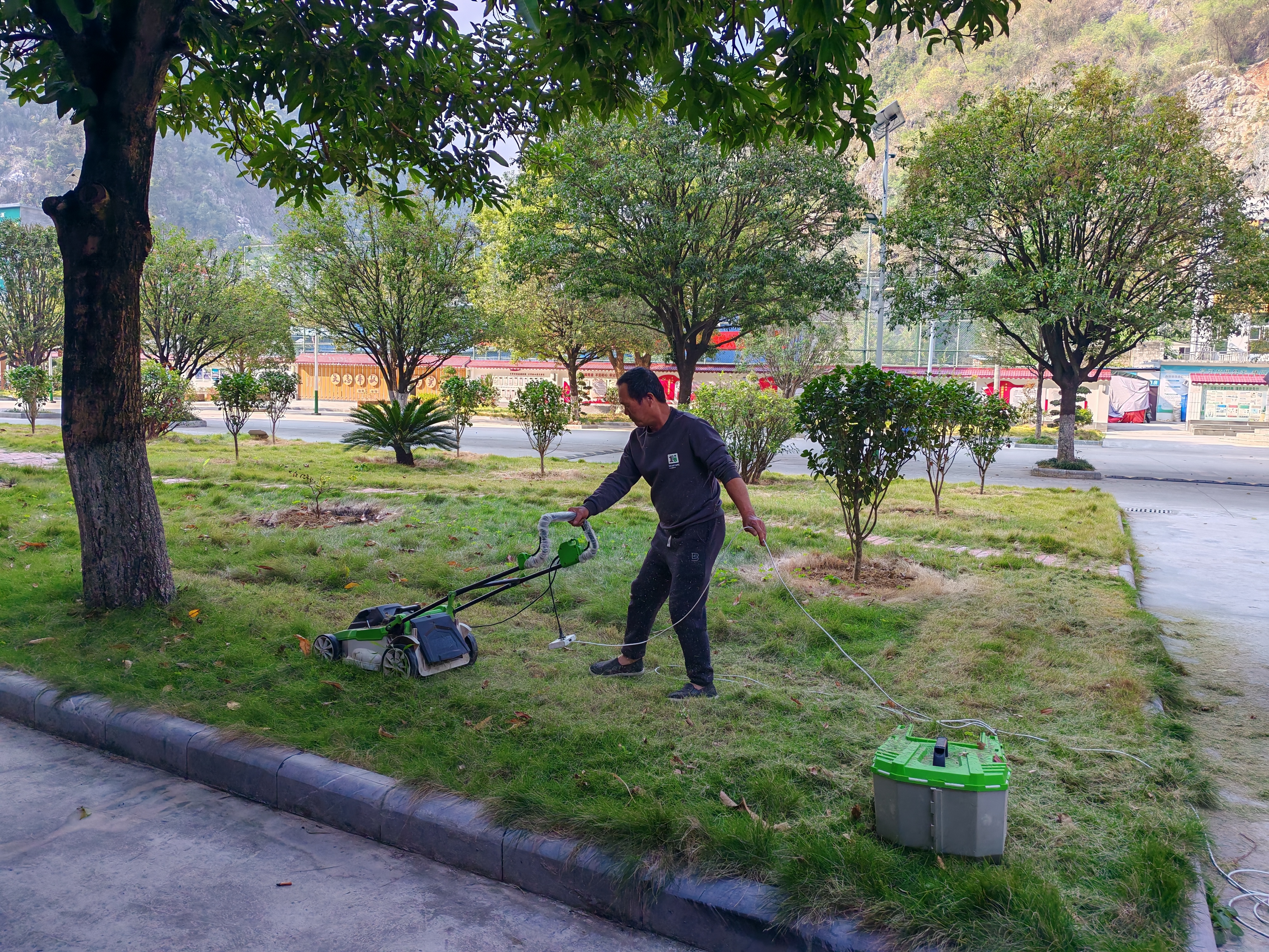 园林工人在修剪草皮