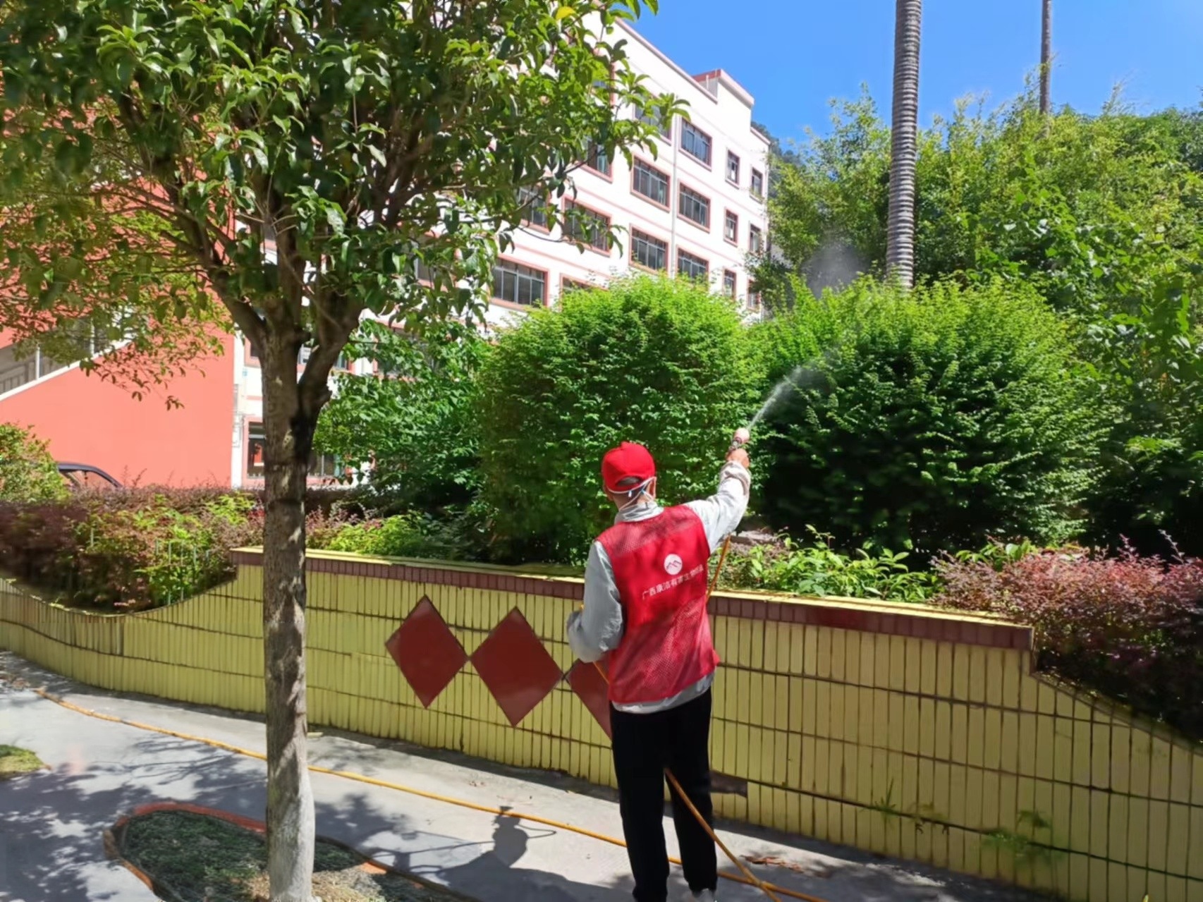 工人对校园绿植进行病虫害防制