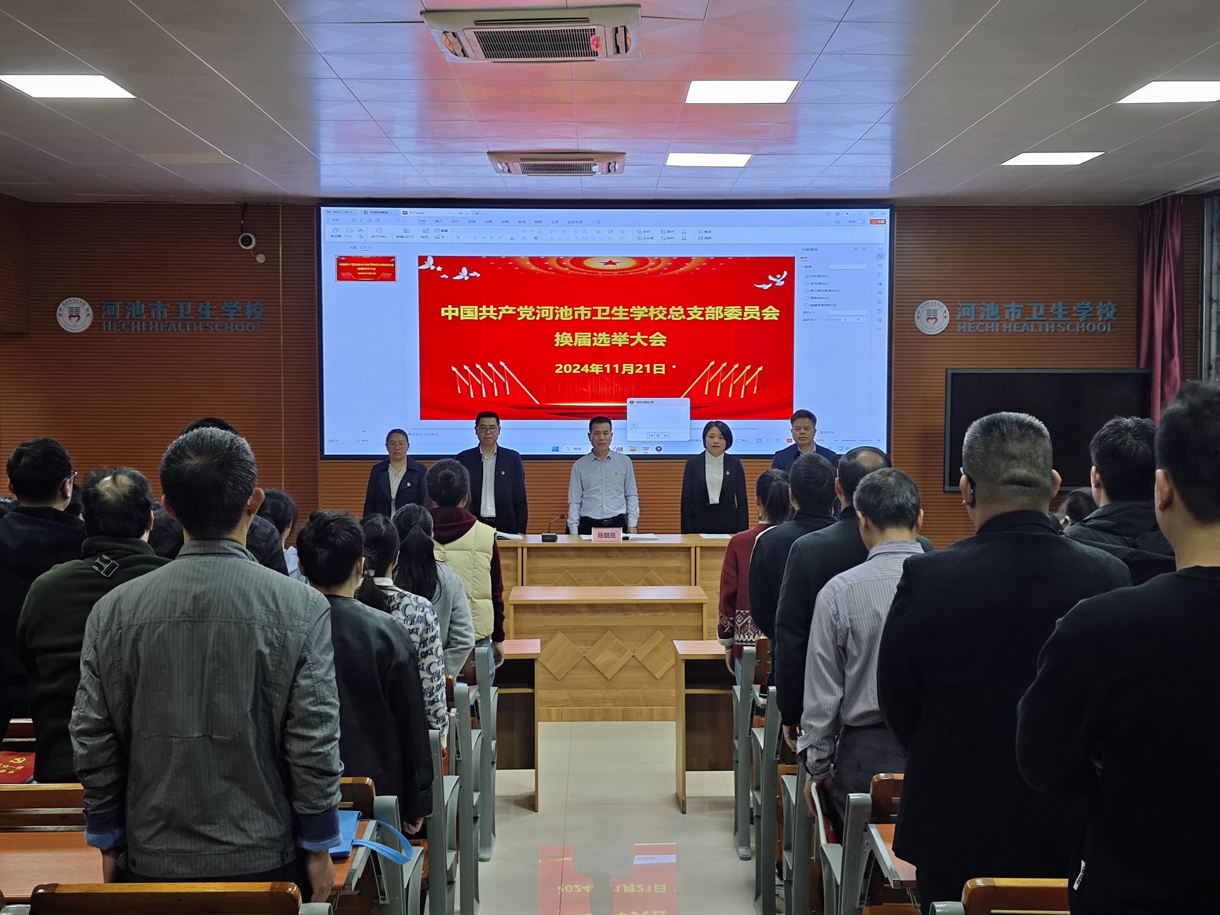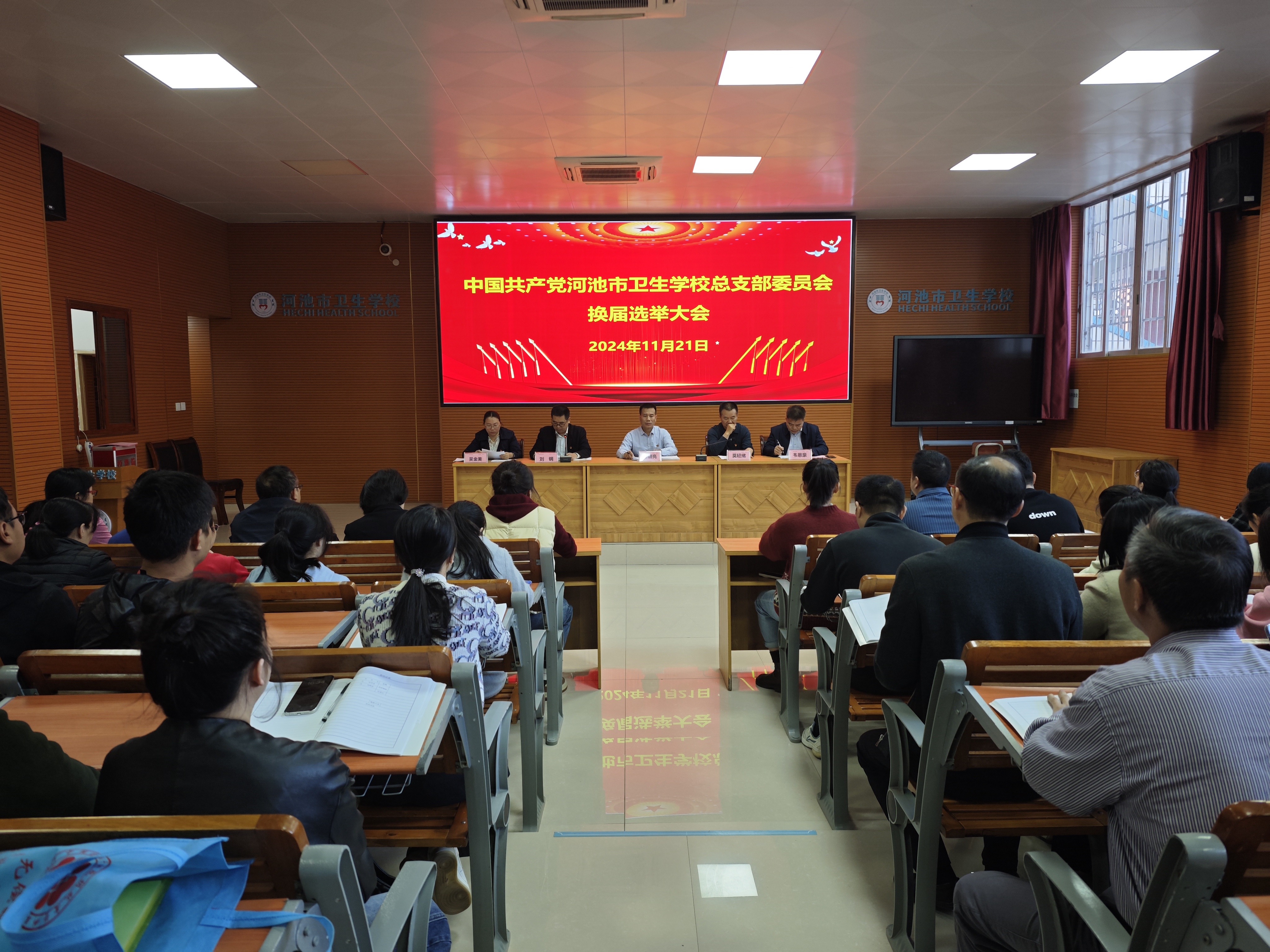 2024年11月21日下午,我校召开党总支换届选举大会,全体党员参加会议。河池市爱国卫生运动指导中心四级调研员莫轻绪同志莅临指导,会议由刘钢同志主持。