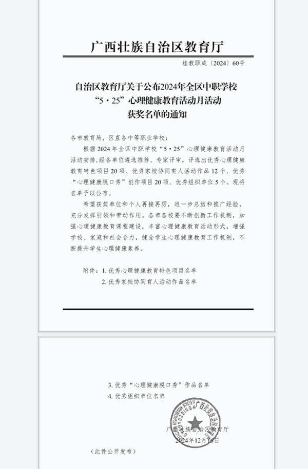 在2024年全区中职学校“5· 25”心理健康教育活动月活动中,经教育厅专家评审,学校心理健康发展中心以“鼓悦心聆·减压赋能”为主题的心理健康教育特色项目获三等奖。