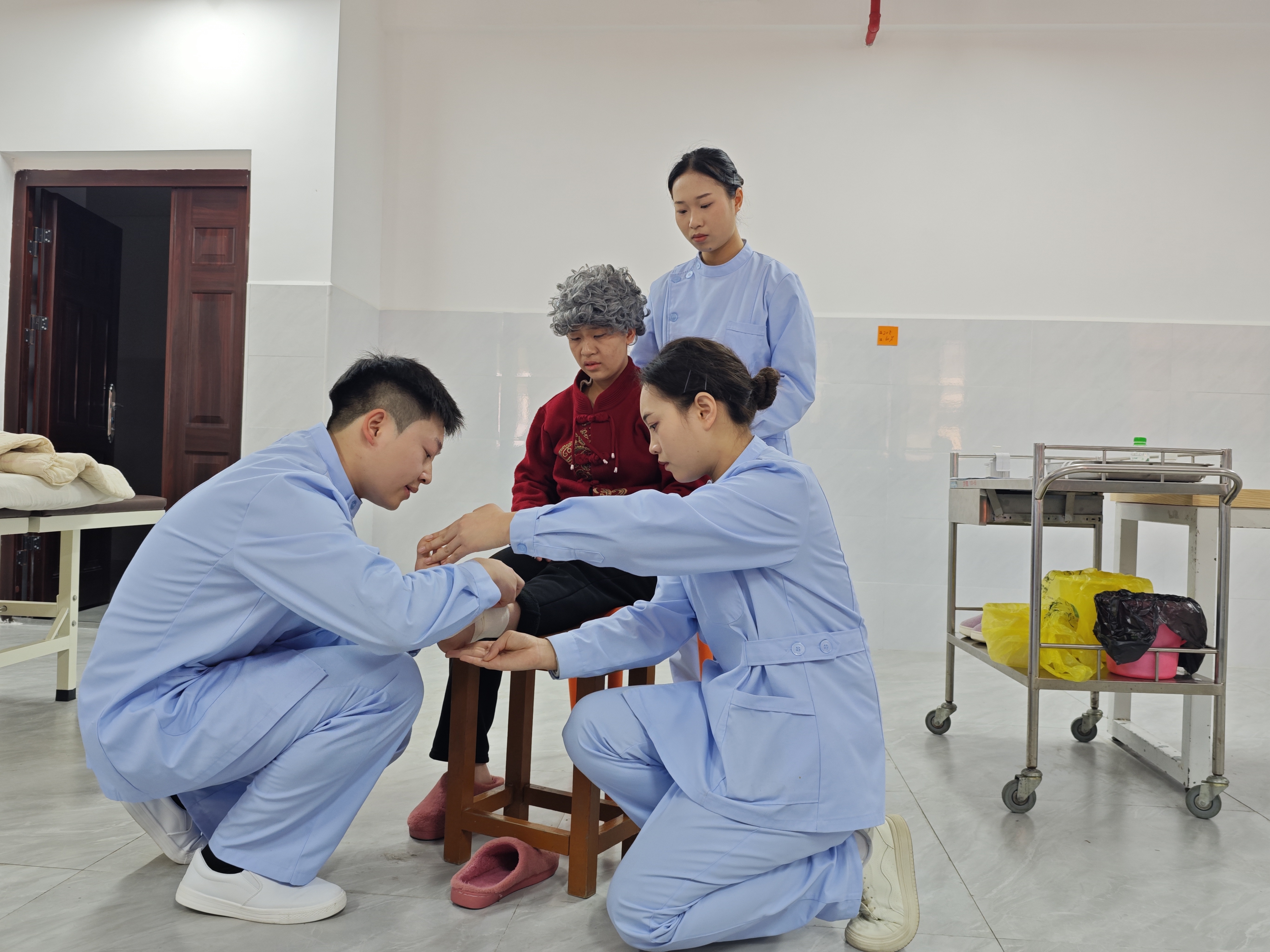 陈朝亮校长、莫苗副校长、刘钢副校长指导选手进行老年照护竞赛训练