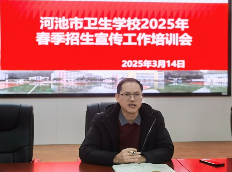2025年3月14日,河池市卫校招就办召开春季招生宣传工作培训会,会议由招就办主任黄鸿宇主持,参加招生宣传教师和招就办全体人员参加培训。