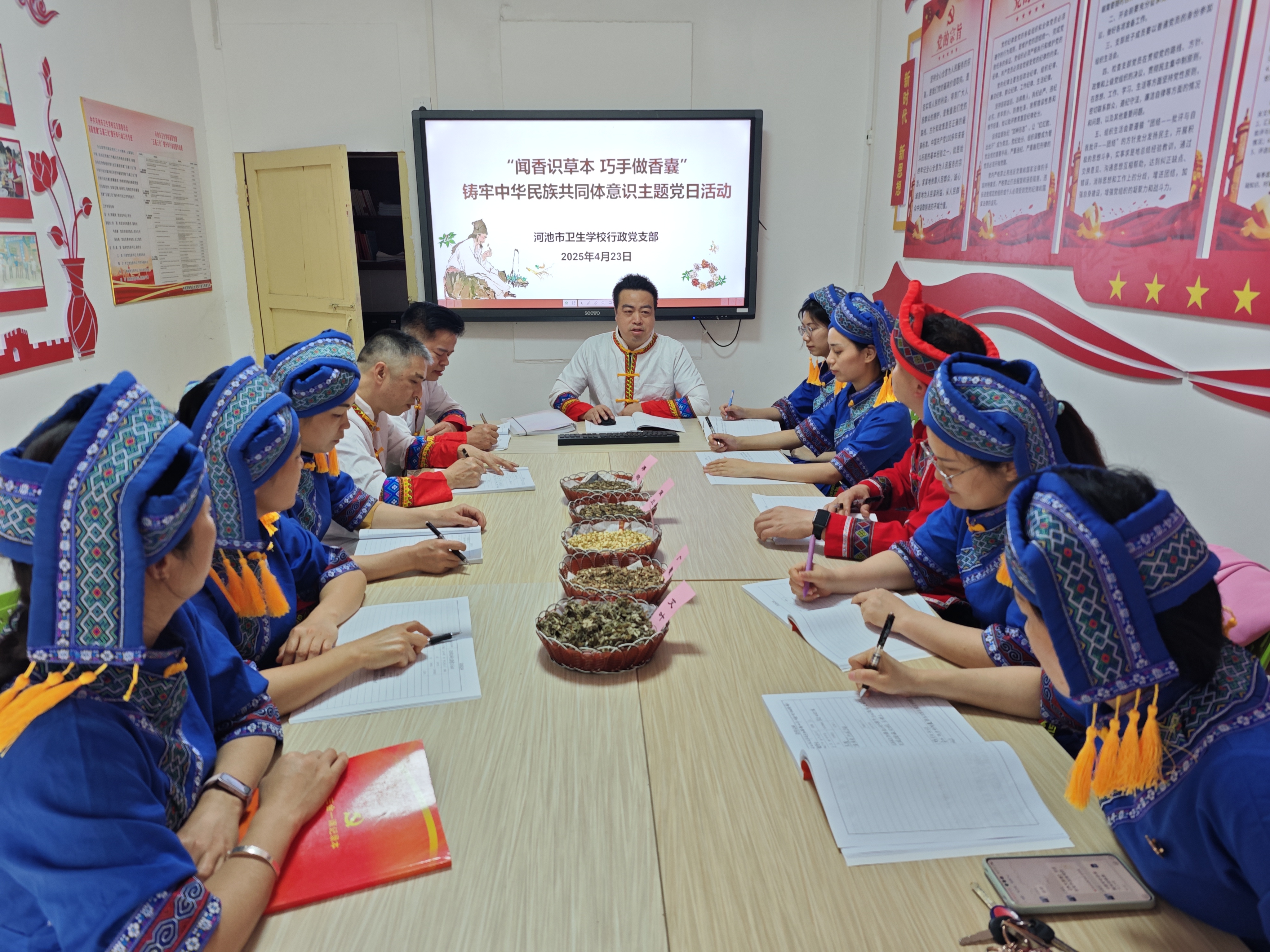 为深化民族团结教育,弘扬中华优秀传统文化,4月23日下午,河池市卫生学校行政党支部组织开展了“闻香识草本 巧手做香囊”铸牢中华民族共同体意识主题党日活动,20余名党员及群众积极参与,在沉浸式体验中感悟中医药文化魅力,共筑民族精神纽带。
