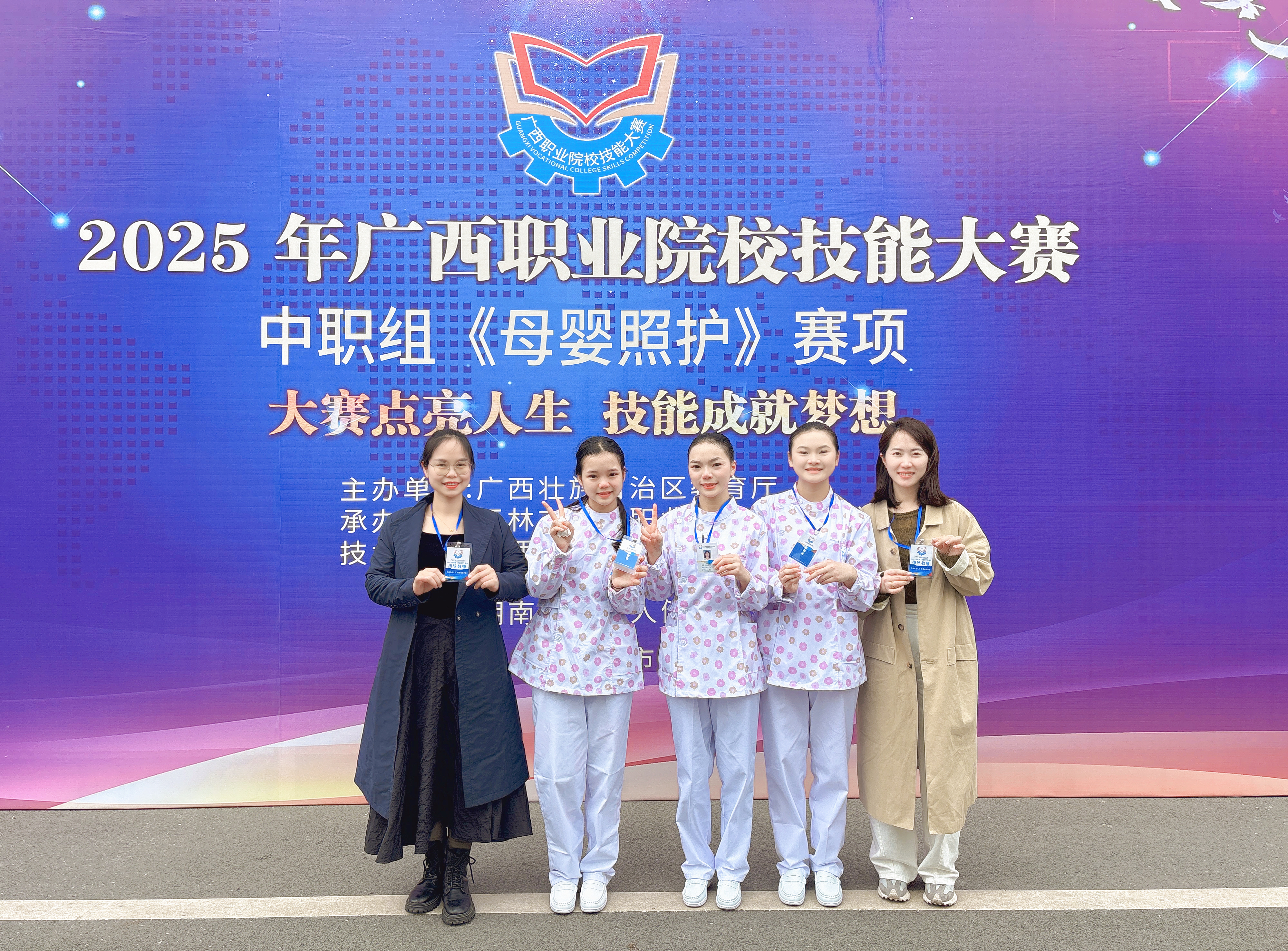 由蒙成丹、覃玉桢老师指导的韦颖培、黄丽双、欧丽婷团队,在《母婴照护》赛项的比赛中表现优异,总成绩排名第2名,荣获金奖。