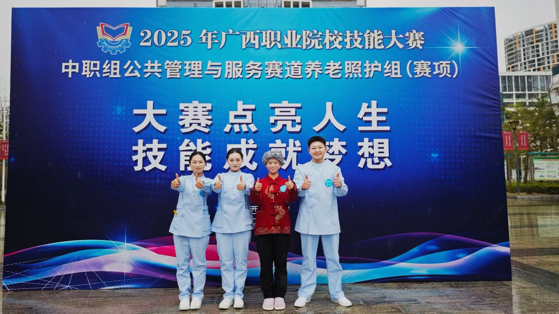 由袁小慧、韦栋老师指导的姚芳婷、宋思琪、邓文林、韦文秘,参加《养老照护》赛项的比赛,荣获银奖。