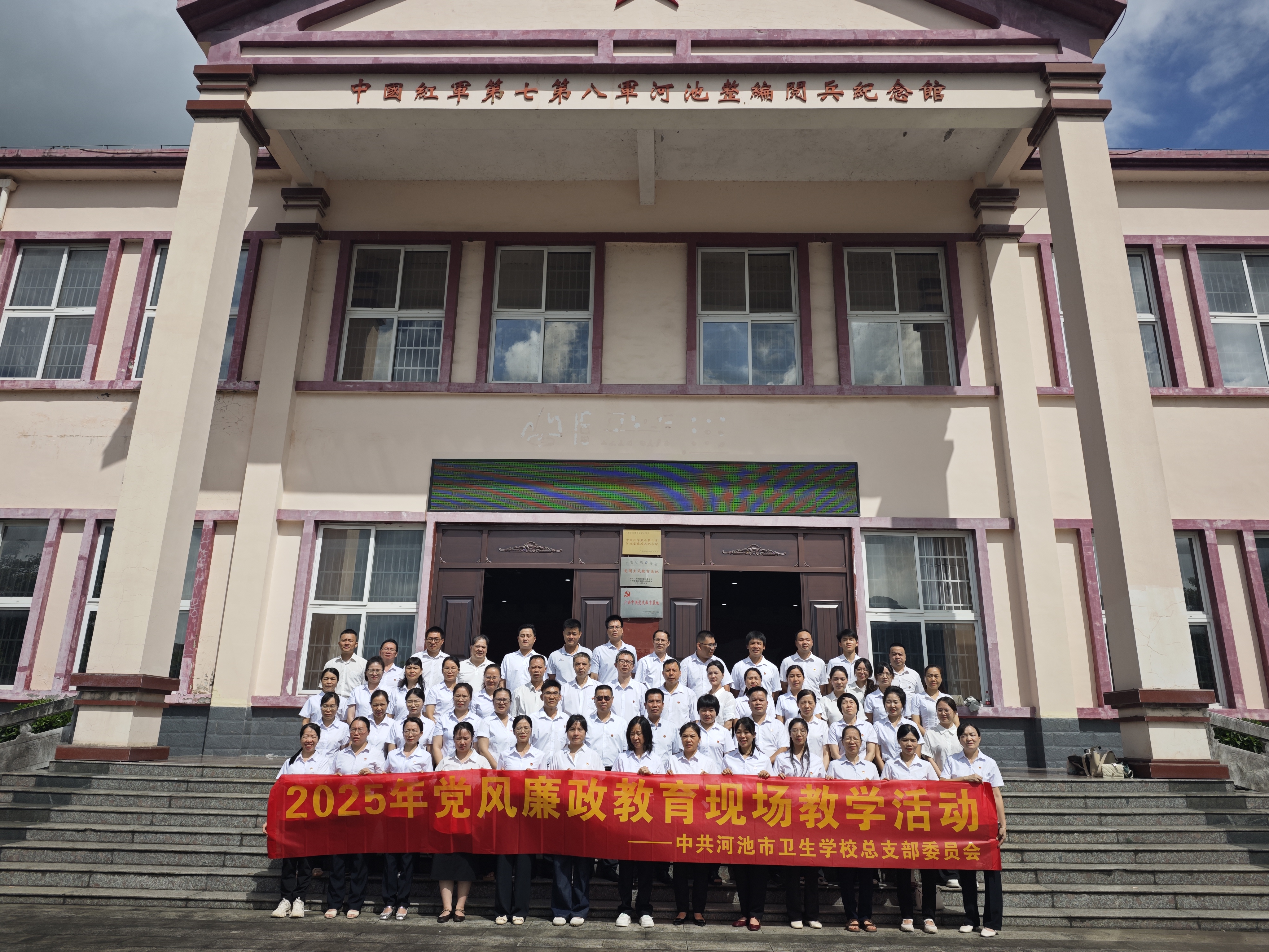 为深入贯彻落实中央八项规定及其实施细则精神,强化党员干部廉洁自律意识,近日,河池市卫生学校组织全体在职党员、入党积极分子、科室负责人及重点岗位人员,走进中国工农红军第七军、第八军河池整编阅兵纪念馆,在革命先烈热血浸染的红色土地上开展党风廉政教育现场教学活动。