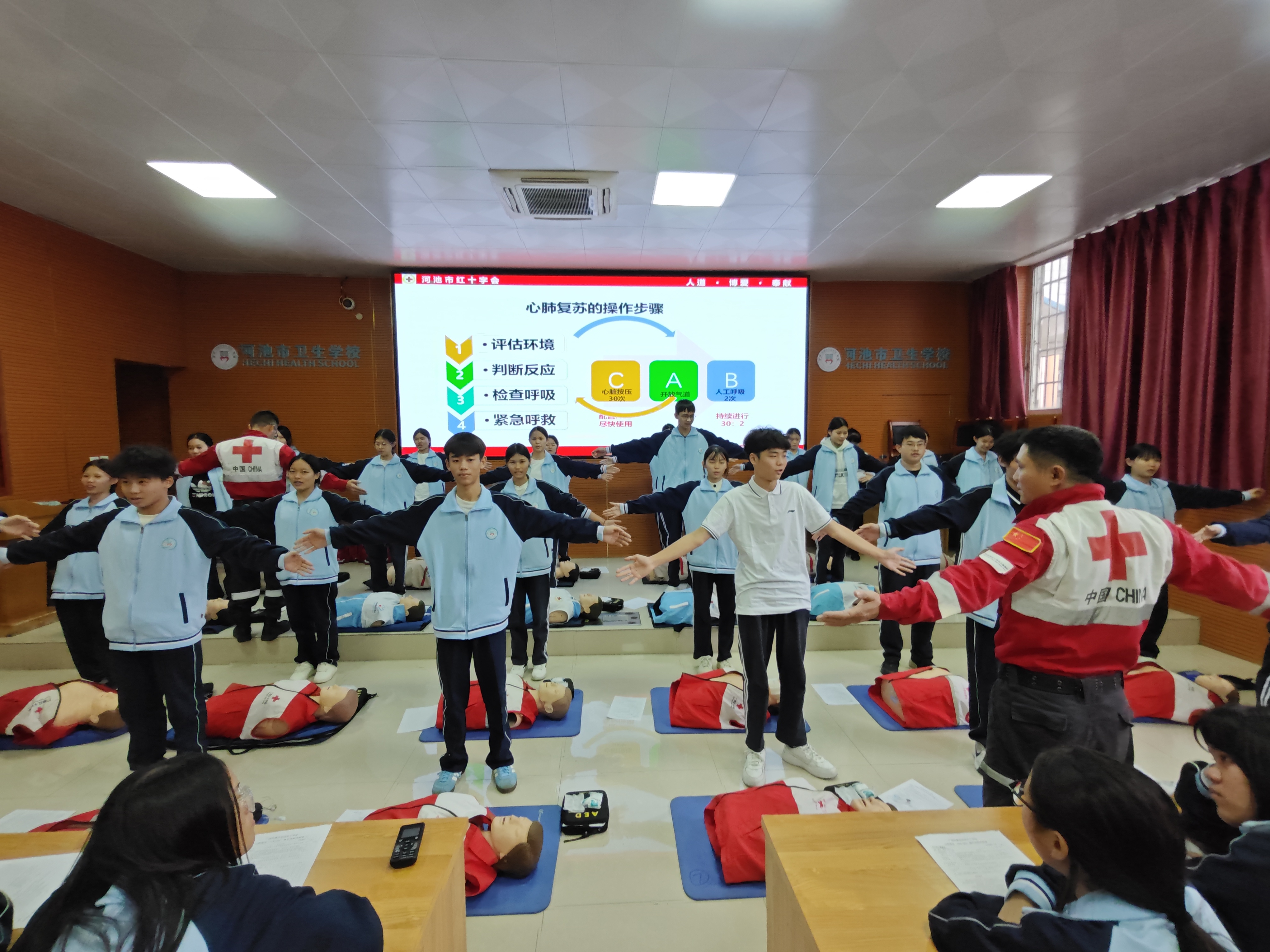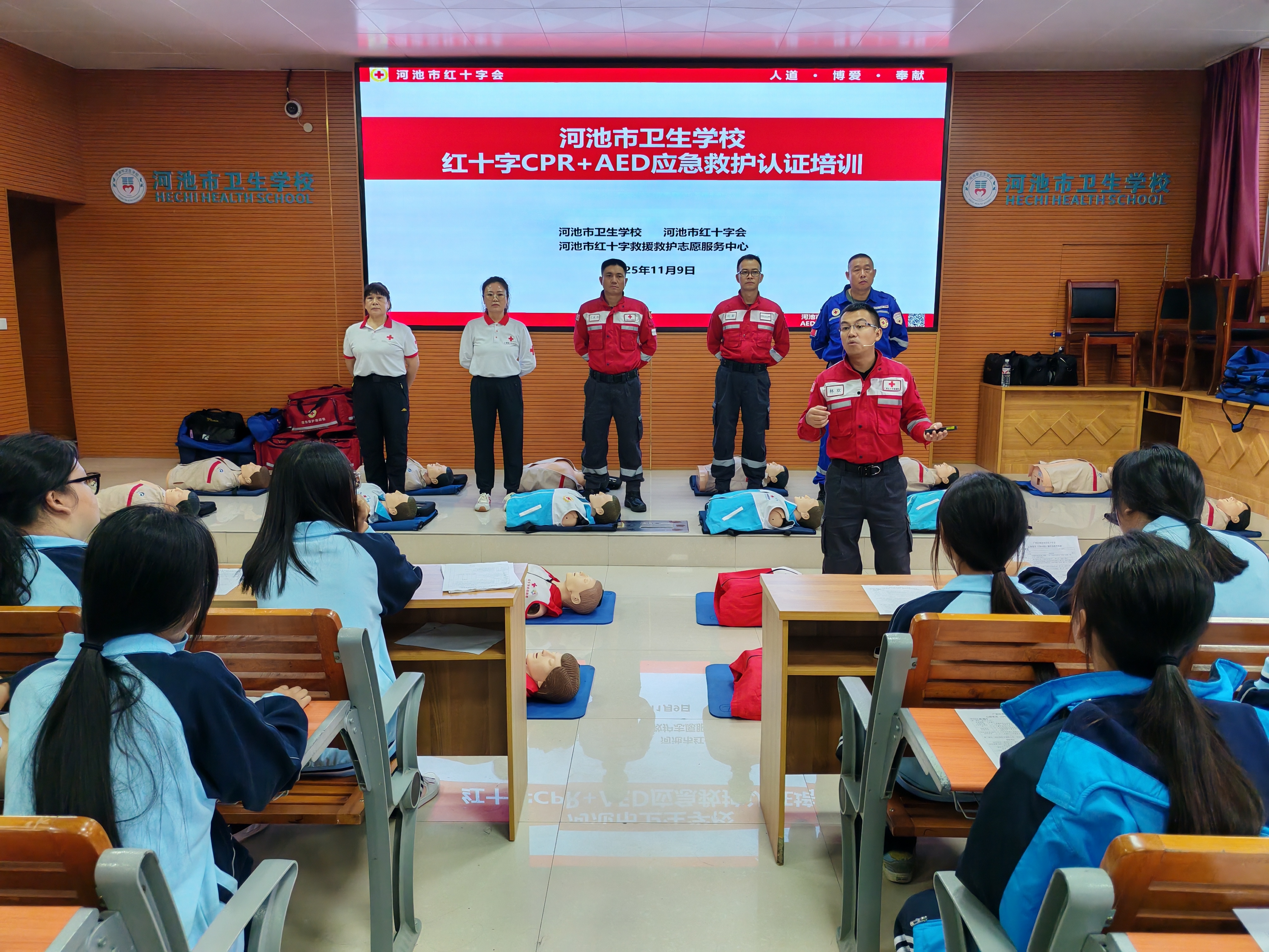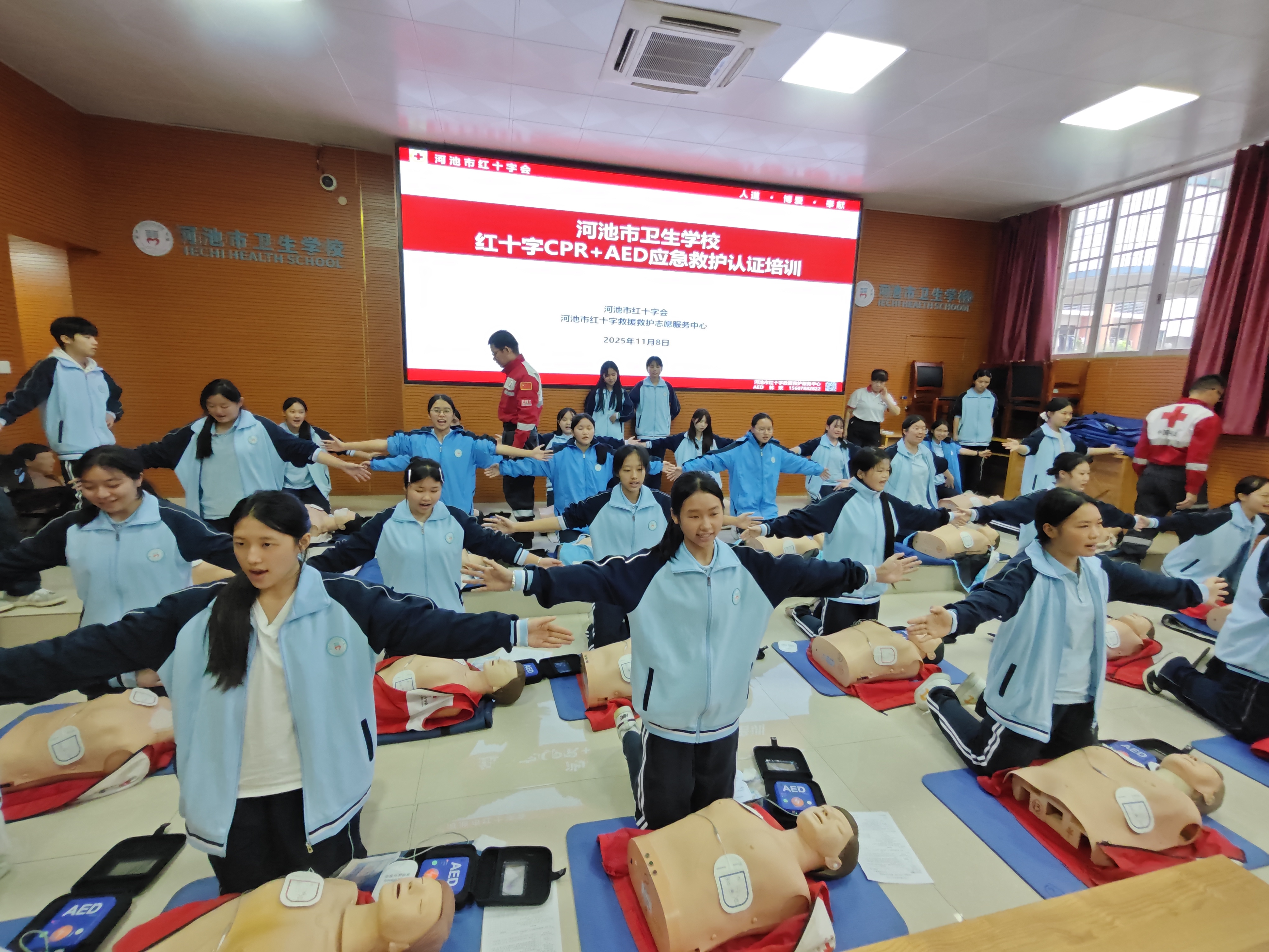 2025年11月8日和9日,河池卫生学校成功举办了两期CPR(心肺复苏)+AED(自动体外除颤器)学生专项急救技能培训。本次培训特邀河池市红十字会专业团队主讲,共计361名在校学生参训。