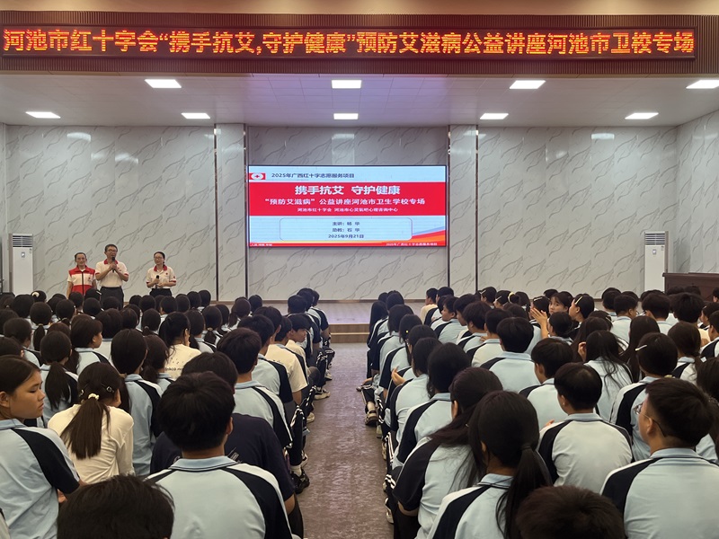 为深入推进艾滋病防治知识普及,增强青年学生健康防护意识,近日,河池市红十字会走进河池市卫生学校,成功举办了一场以“携手抗艾 守护健康”为主题的预防艾滋病公益讲座。学校2025级全体新生齐聚一堂,认真聆听了这场内容详实、互动积极的健康知识课。