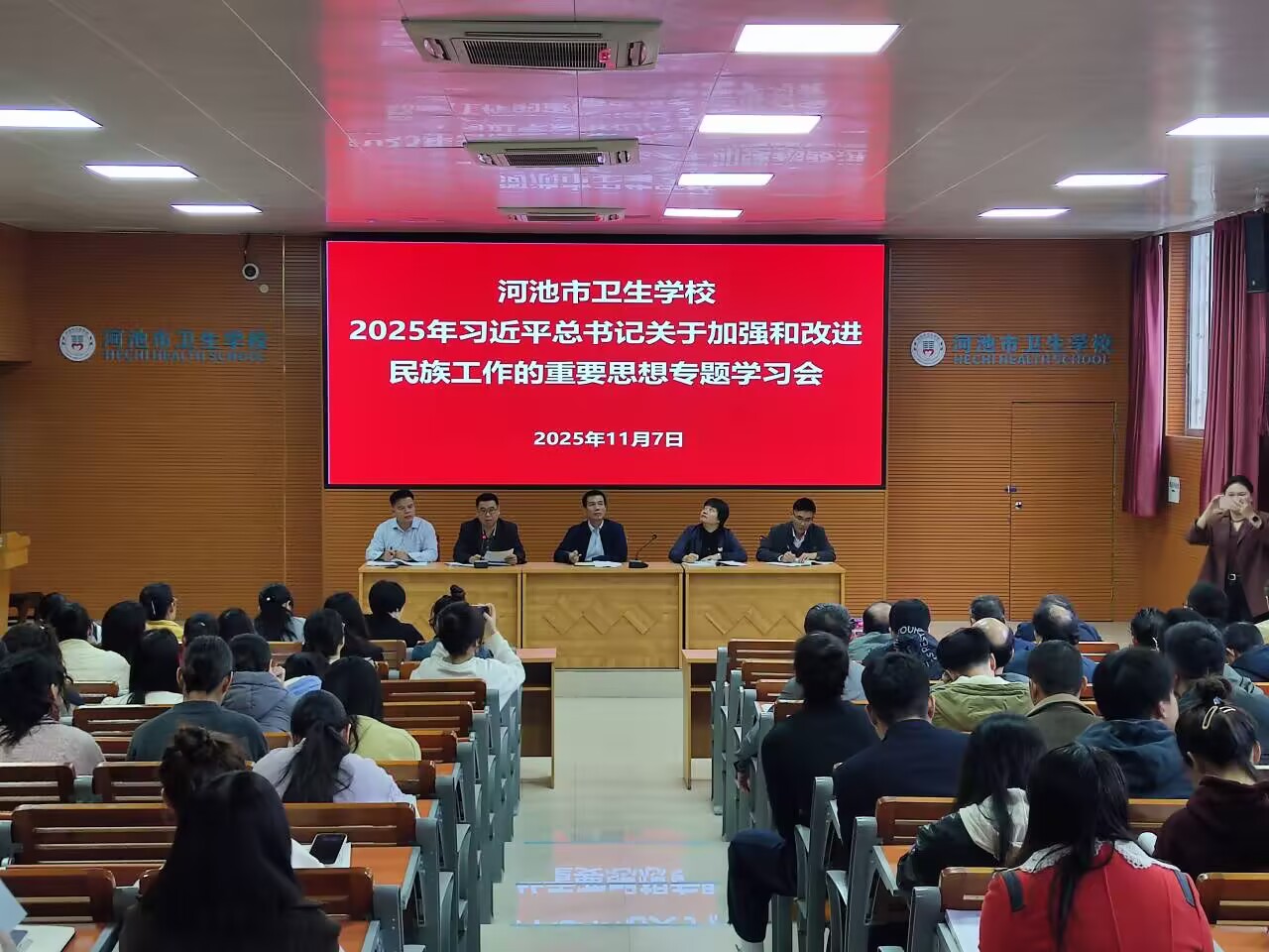 为深入学习贯彻习近平总书记关于加强和改进民族工作的重要思想,牢牢把握新时代民族工作的根本遵循,河池市卫生学校于2025年11月7日组织全体教职工开展专题学习会。