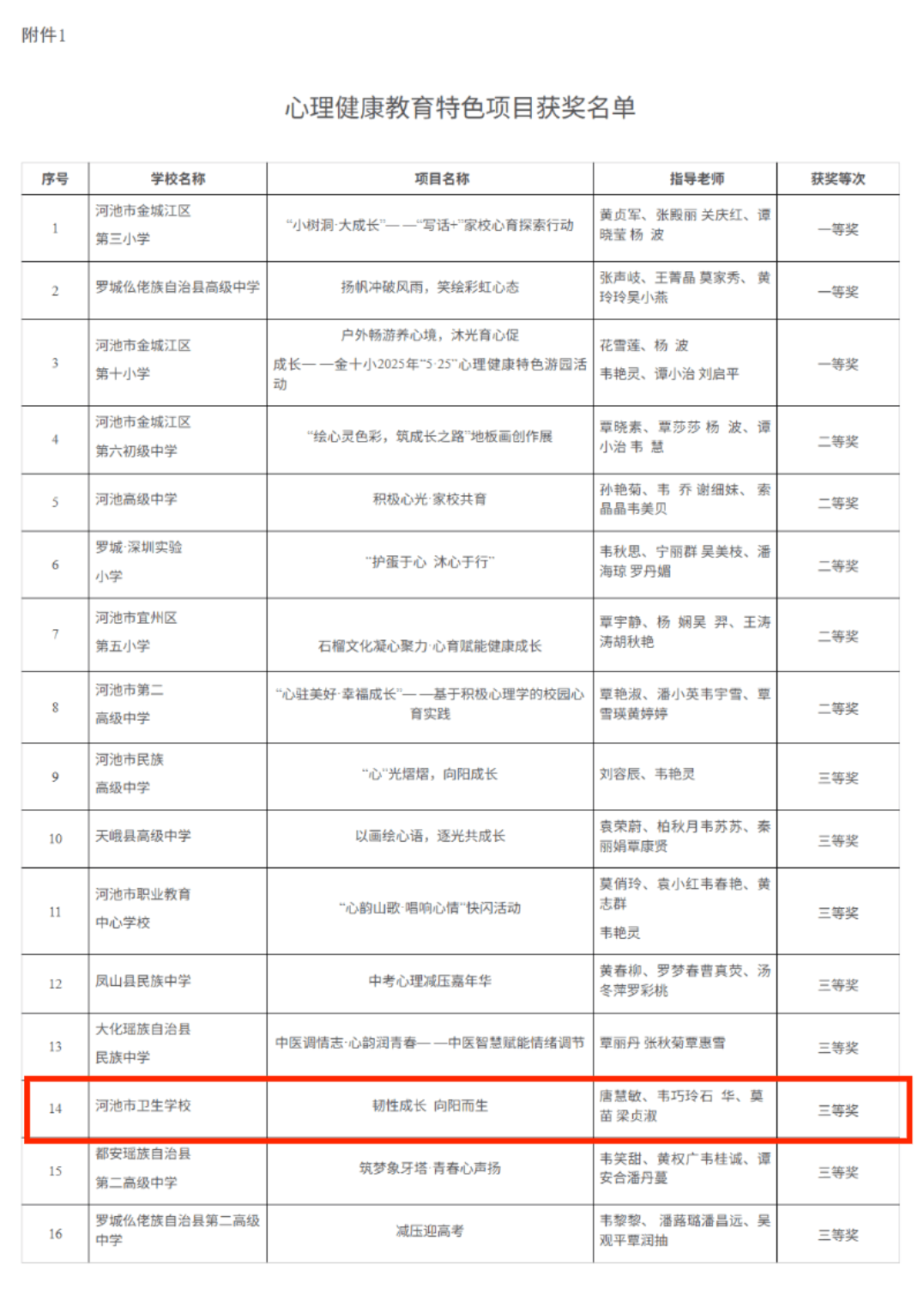 近日,河池市教育局公布2025年全市中小学生"5·25"心理健康教育活动月获奖名单,河池市卫生学校心理中心报送的《韧性成长 向阳而生》心理健康教育特色项目荣获三等奖。